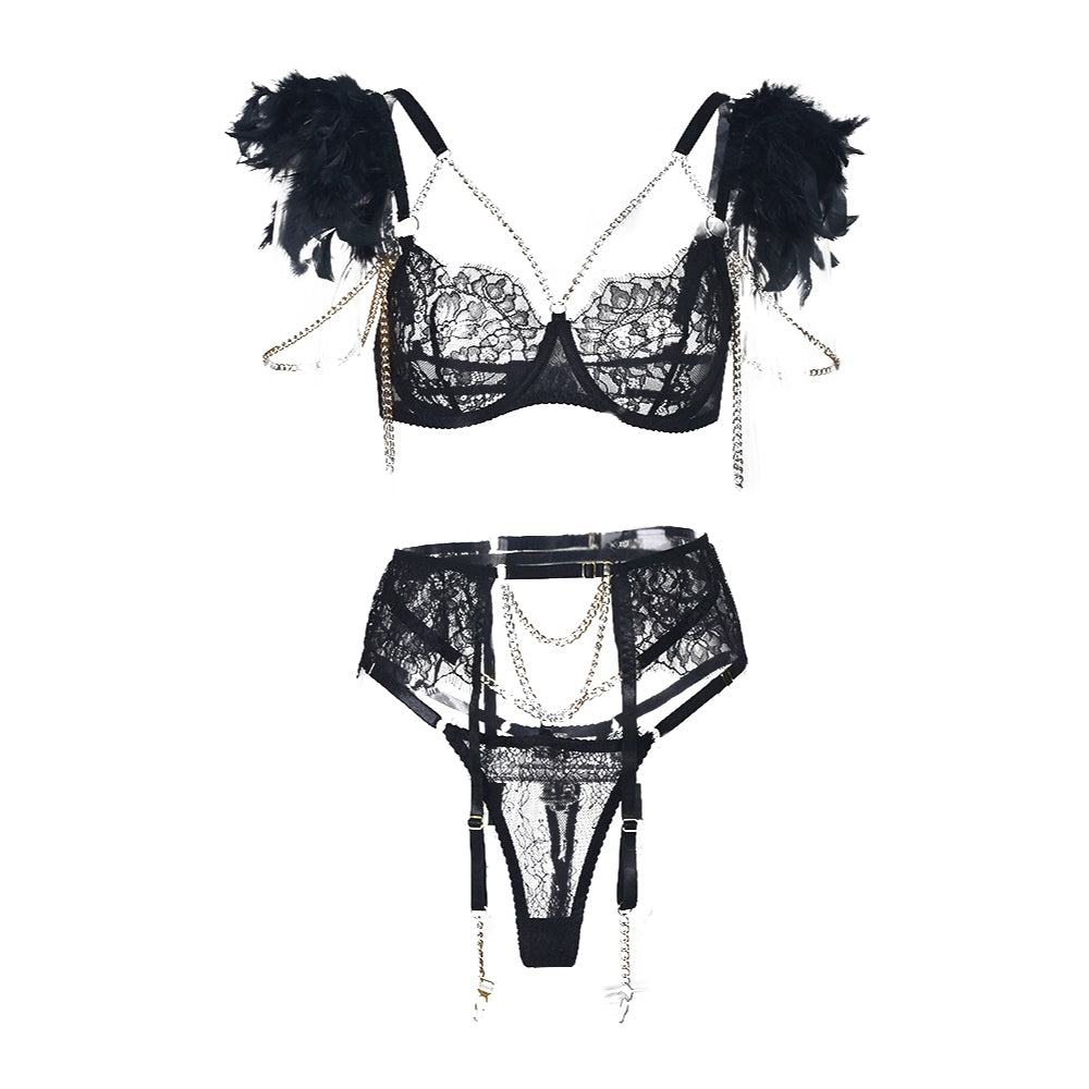 Design: Gorgeous feather lingerie, sexy transparent eyelash lace lingerie, elegant sexy set, this matching underwire bra and panty sets with belt and thigh bands is featured with thick lush feathers, which shows your curve elegantly. Hook & eye closure and adjustable chain straps make it easy for wearing.