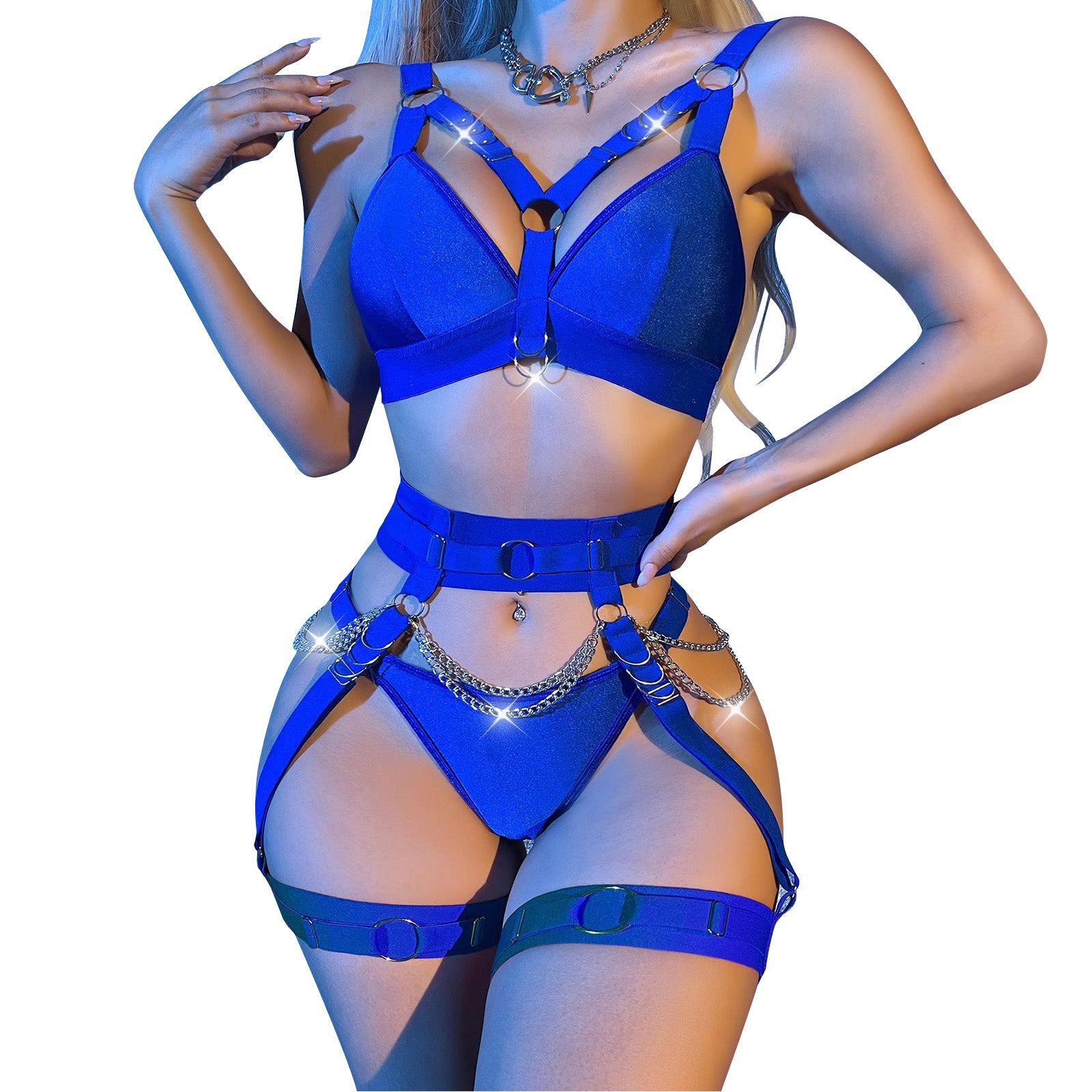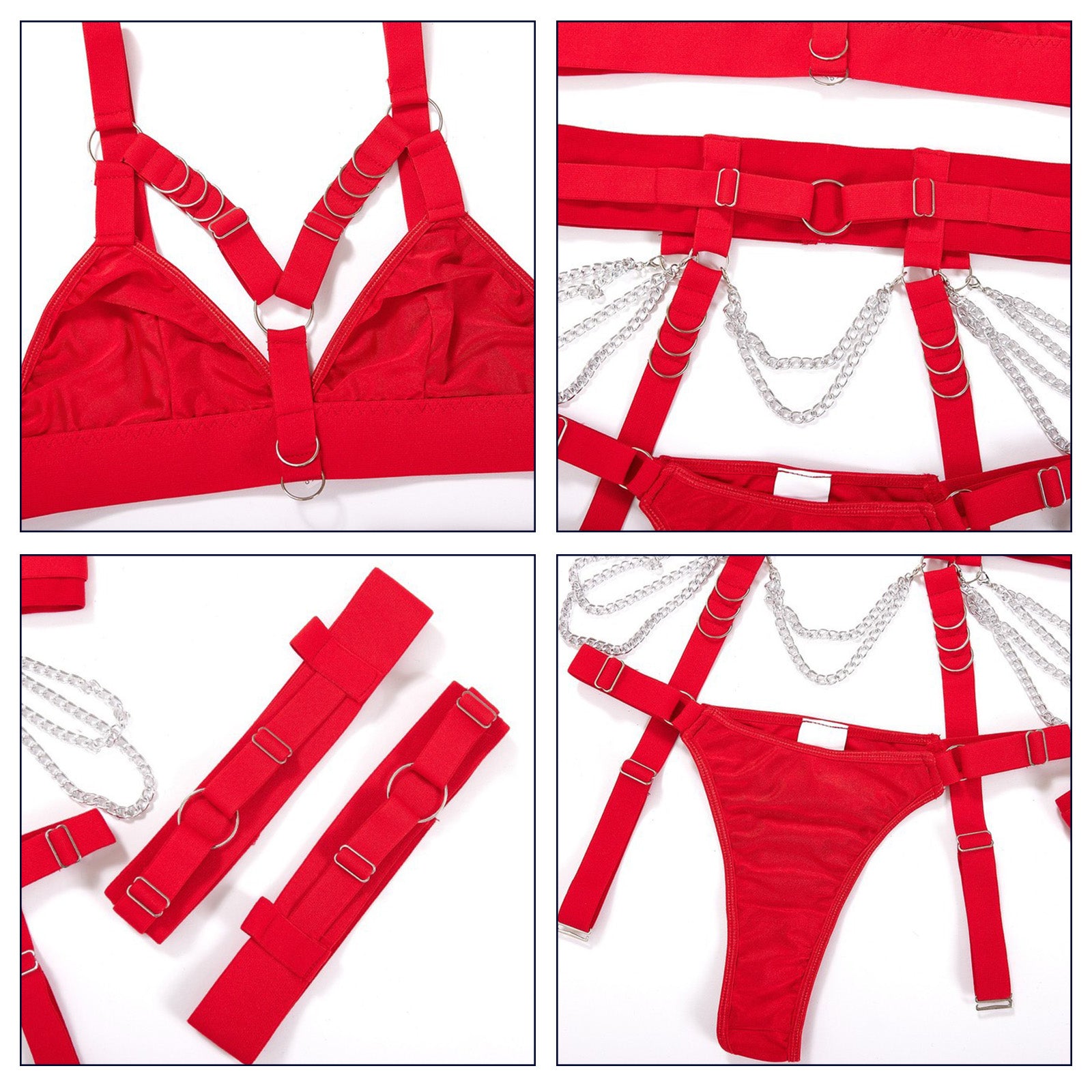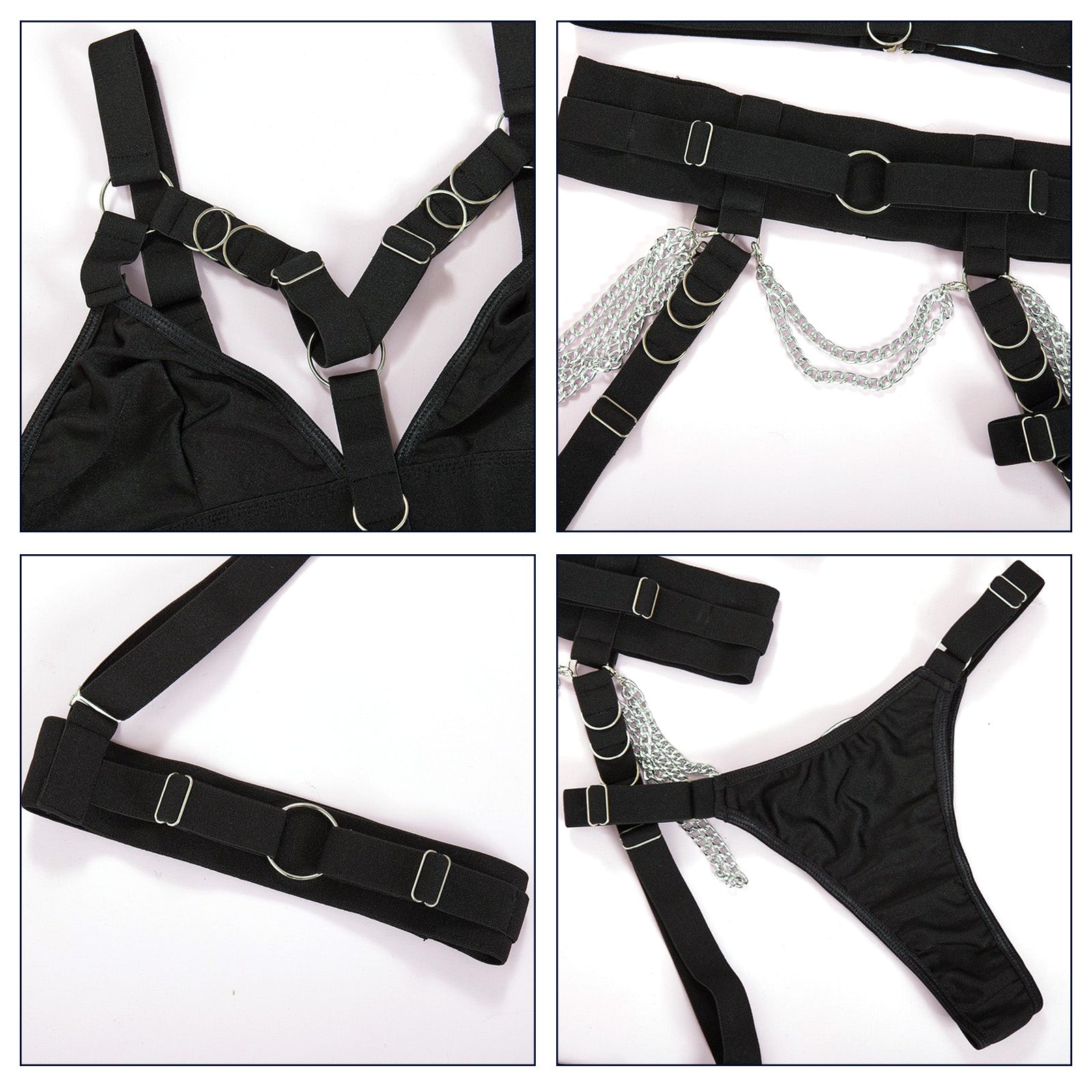 Design: This sultry bra and panty set features non padded underwire cups with multi-strap O-ring accents, adjustable spaghetti straps, a back hook closure, a matching high waisted garter belt with adjustable garter straps, draping front chains, and a matching panty.