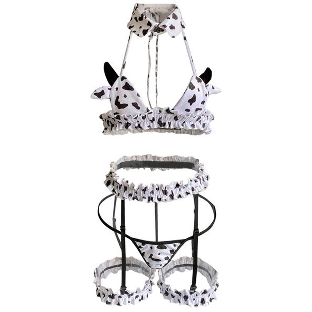 - Design: Cow Costume Lingerie Set Features, Cow black & white spot printed with cow ear, with adjustable garter belt to fit your body well, making you more lovely and sexy to spice up your night. Women's sexy cow panty costume features sexy push up bodysuit. Show you perfect body;