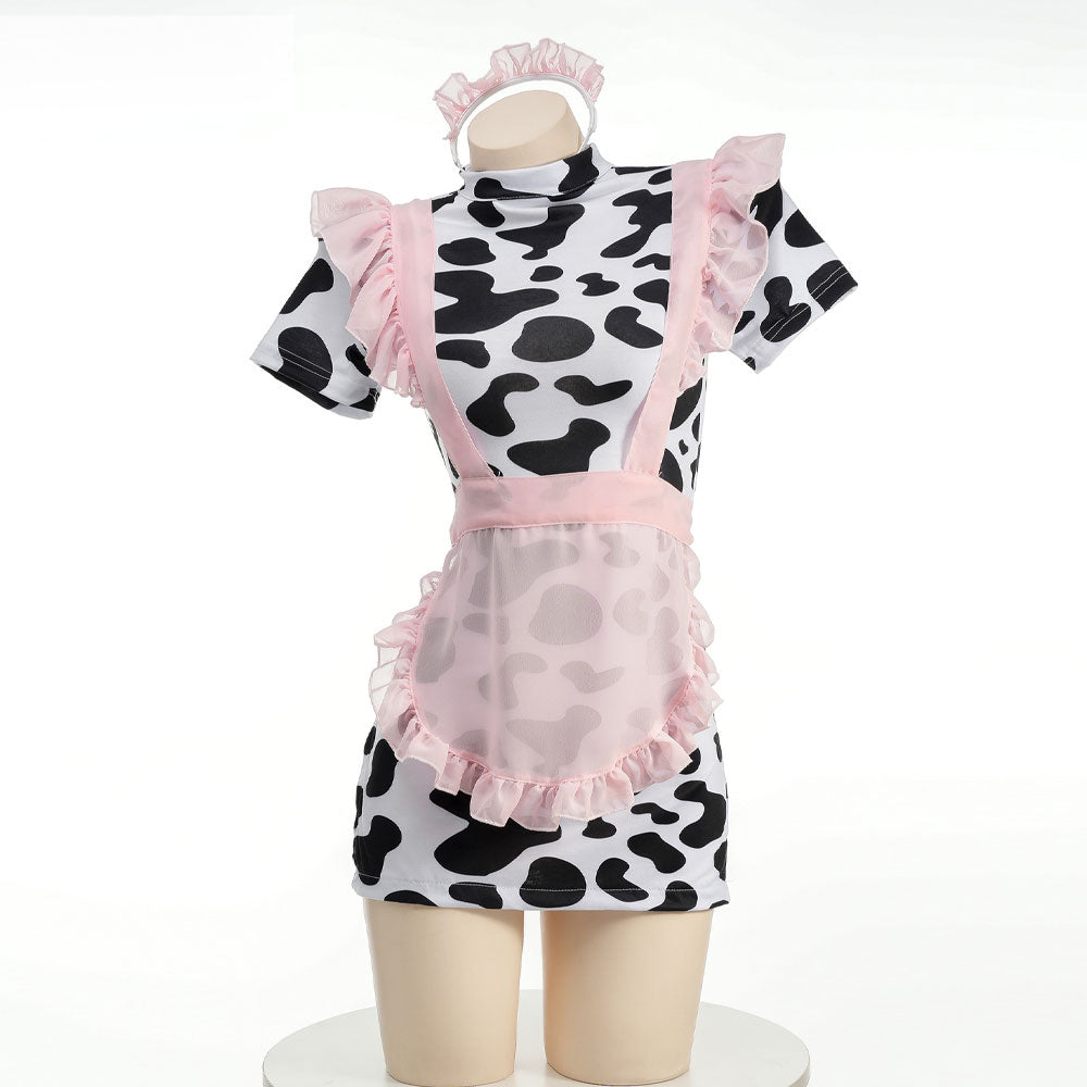 Design: Sexy cow maid outfit featuring a cow print mini dress, mock neckline and short sleeves, back zipper up closure, sides slit hemline, and a matching pink maid apron. This lingerie set is designed to flatter and turn heads. Perfect for adding a playful anime touch to your wardrobe, enjoy feeling comfortable and chic.