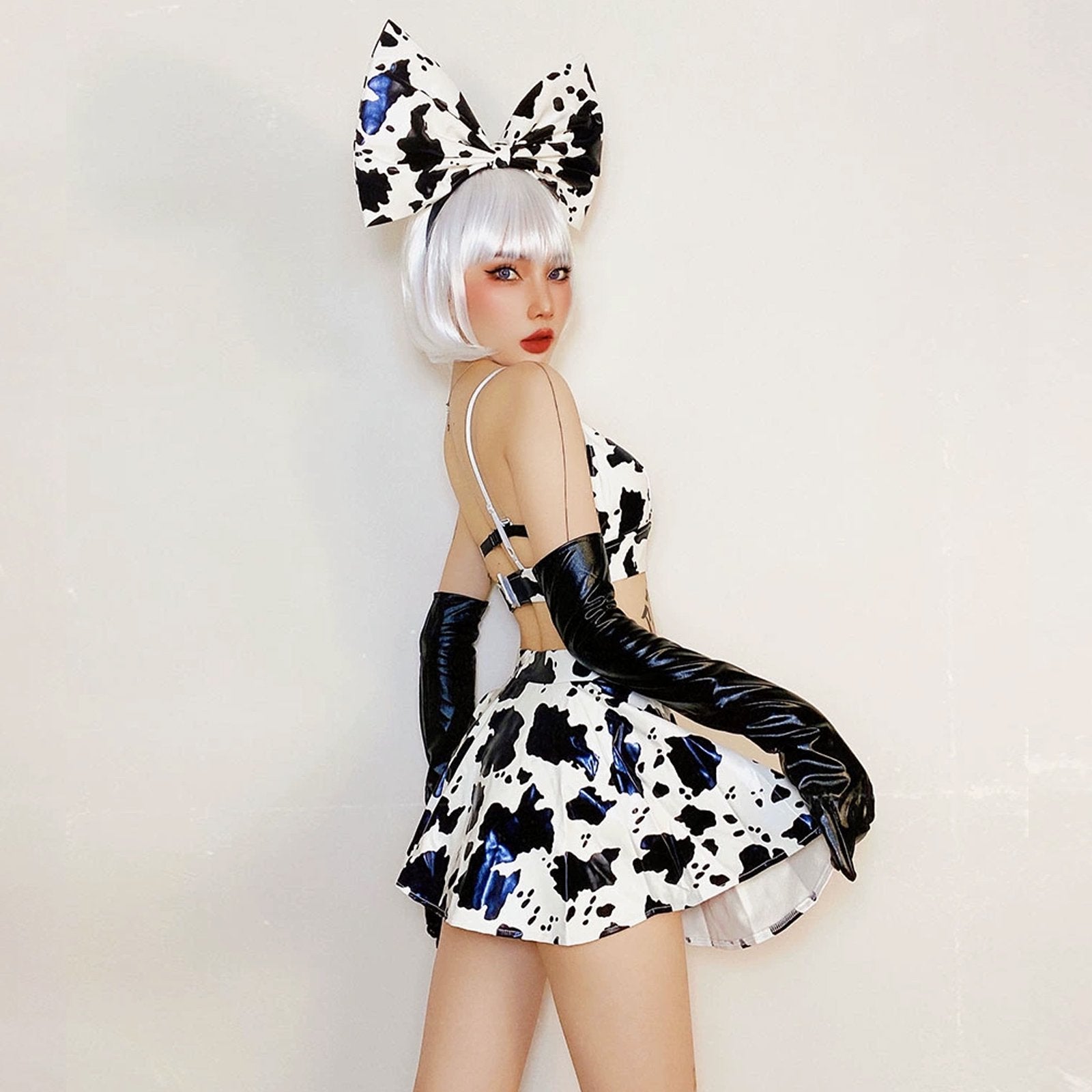 Design: Asrrss sexy latex cow print cosplay costumes featuring wet look cow print print triangle cups, adjustable elastic shoulder straps, back velcro closure, a matching sassy mini skirt, a low cut waistband with side zipper up, show off your unique style with this stunning cow print cosplay lingerie set.