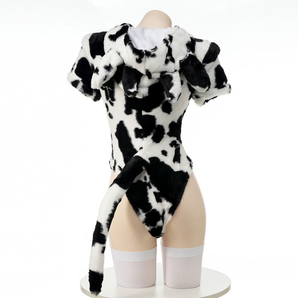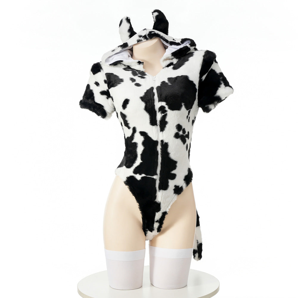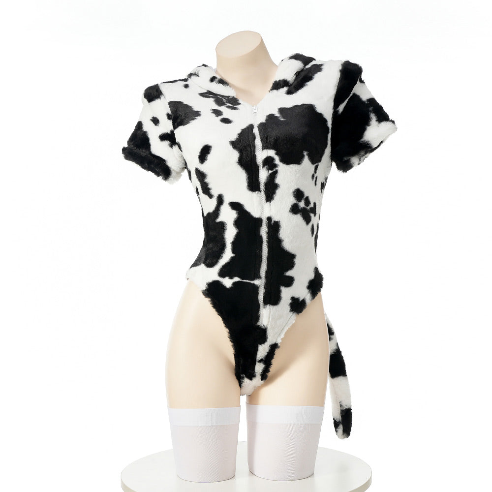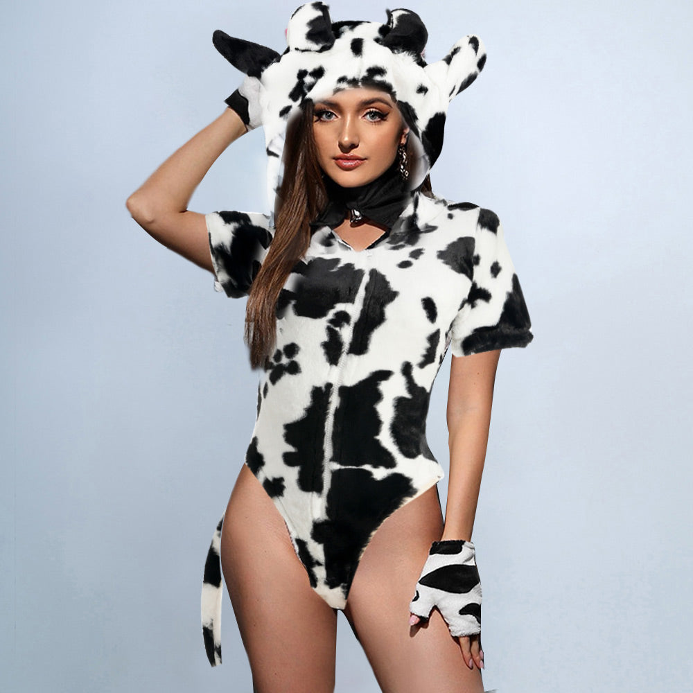 Design: Sexy Cow Costume lingerie, short sleeve, cow black & white spot printed and an attached hood with a horns detailing, back long tail accents, making you more lovely and sexy to spice up your night! Zipper closure detail for ease of dressing/un-dressing.