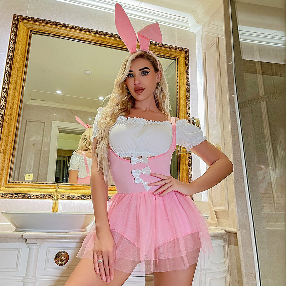 Design: This Sexy Bunny Outfit featuring a ruffled, white crop top with an off-the-shoulder neckline, puffed short sleeves, and a matching pink bodysuit with a tiered mesh peplum, white satin bow accents. Elevate your style and show off your curves with this charming ensemble.