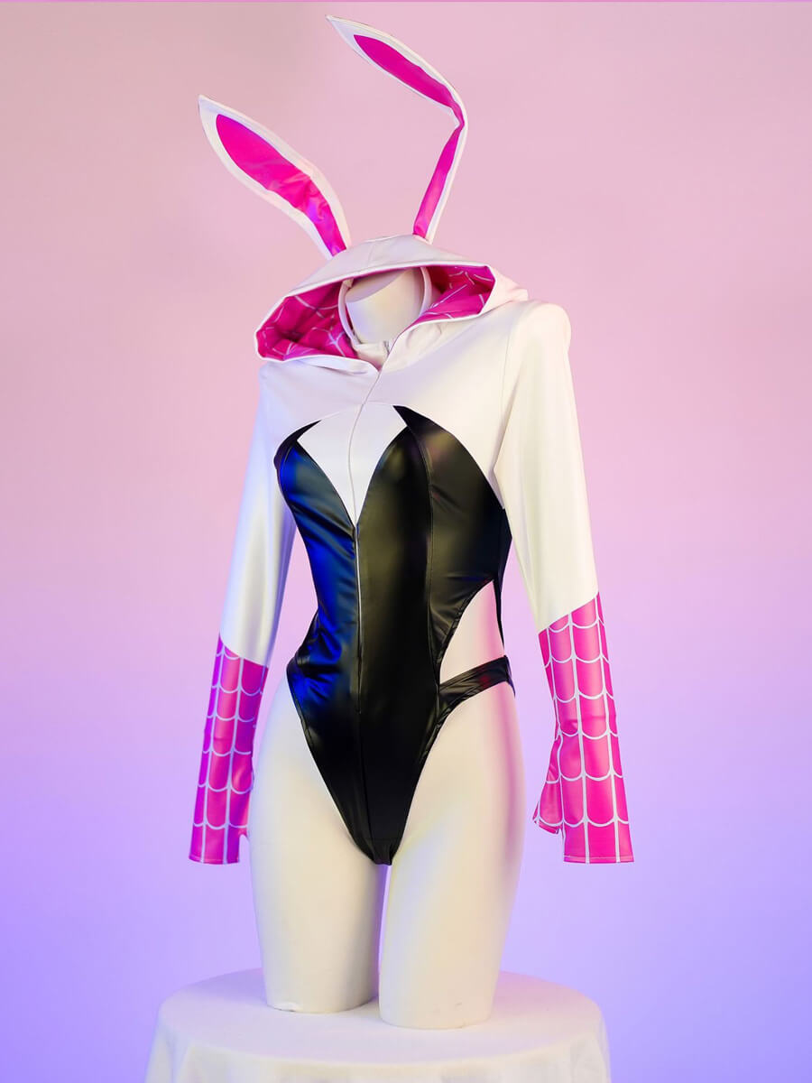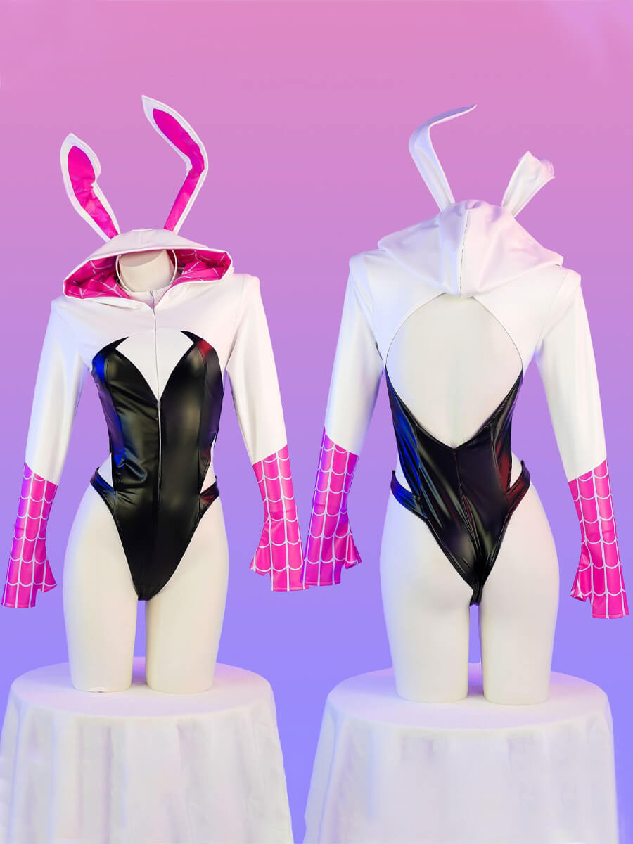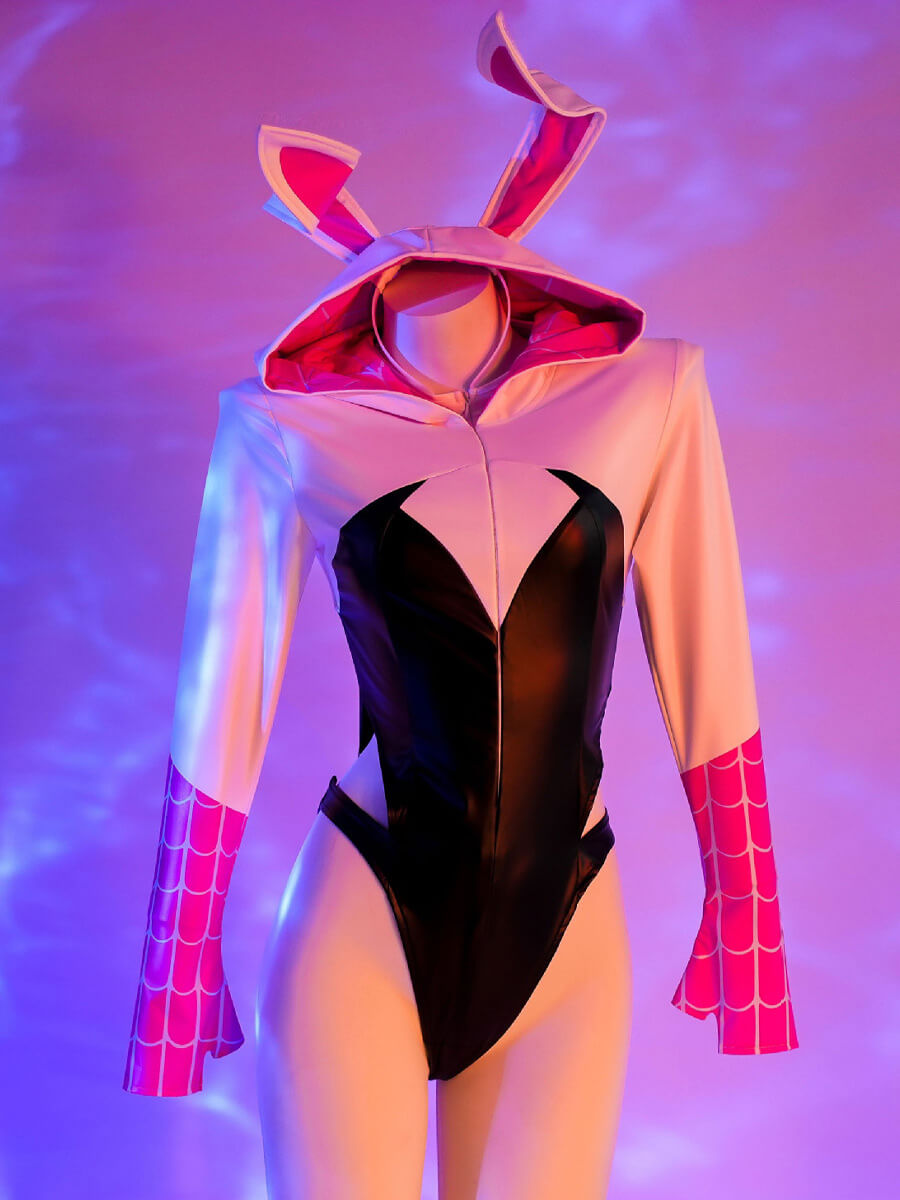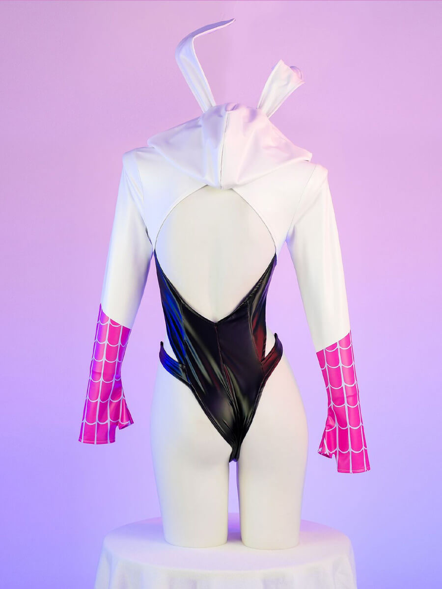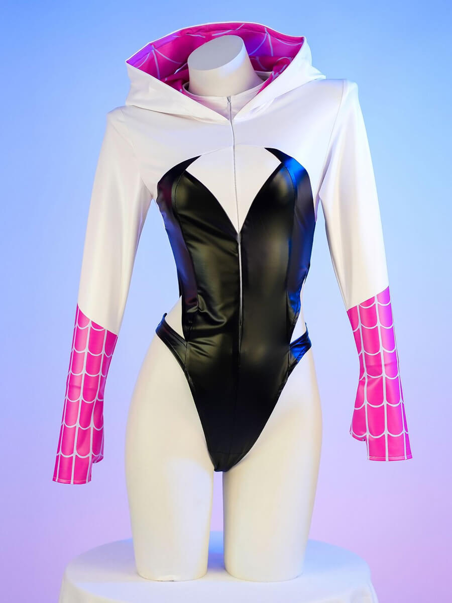 Design: Women‘s Superhero Costume featuring vinyl hooded bodysuit with a zip-up front, long sleeves with thumb loops and spiderweb detailing, sides cut-out design, and a back keyhole panel, It's a seductive and unique piece that offers a daring and playful look.