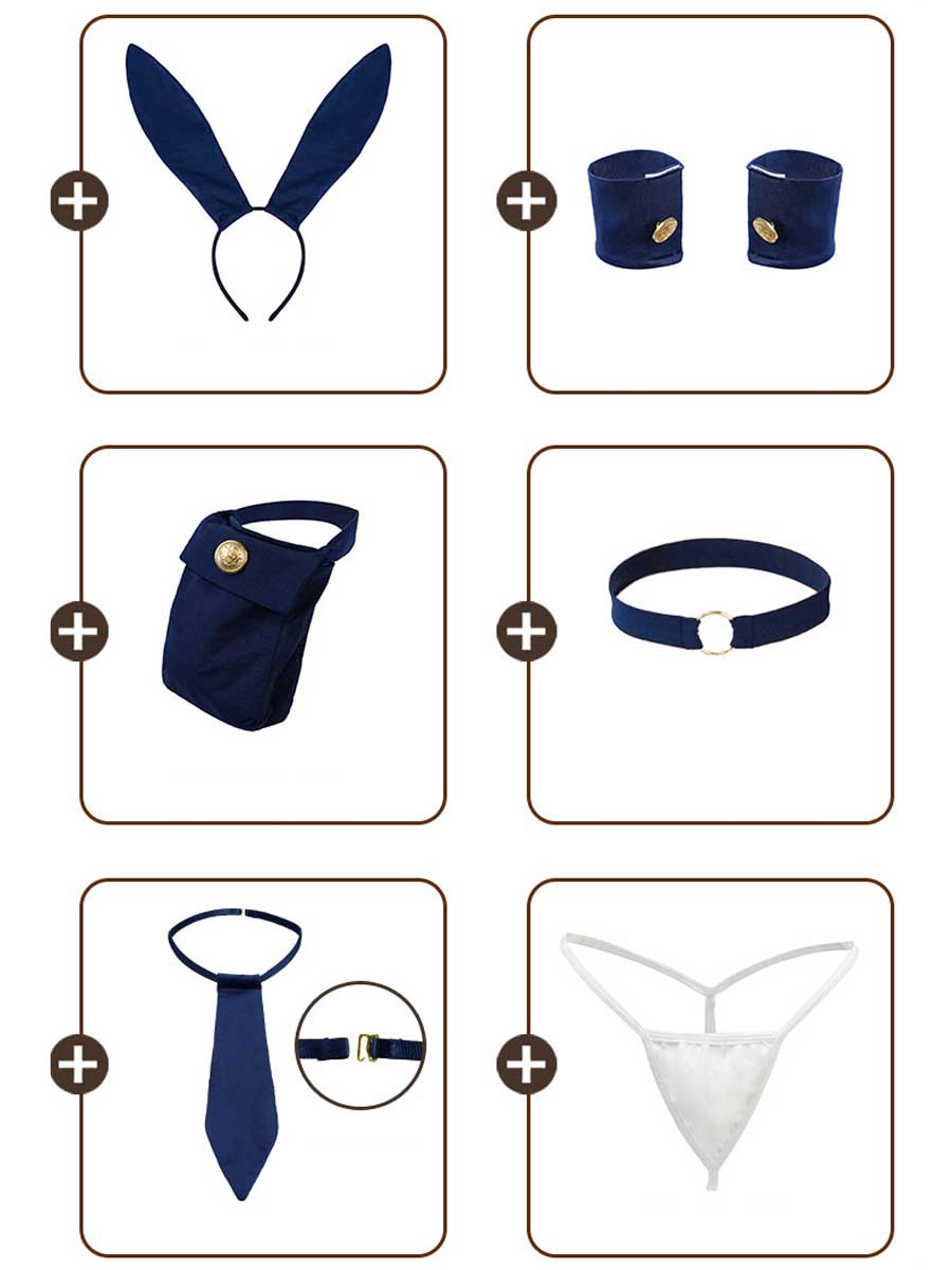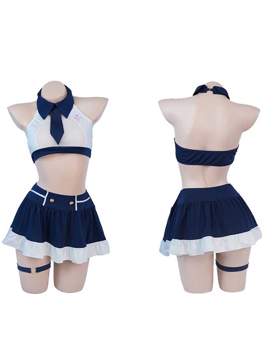 Design: This Sexy Bunny Lingerie featuring a white collared crop top with halter neckline, blue wrist cuffs, a navy blue mini skirt with white ruffled trim, and a matching bunny ear headband, this costume creates an edgy yet playful look that will get all the attention.