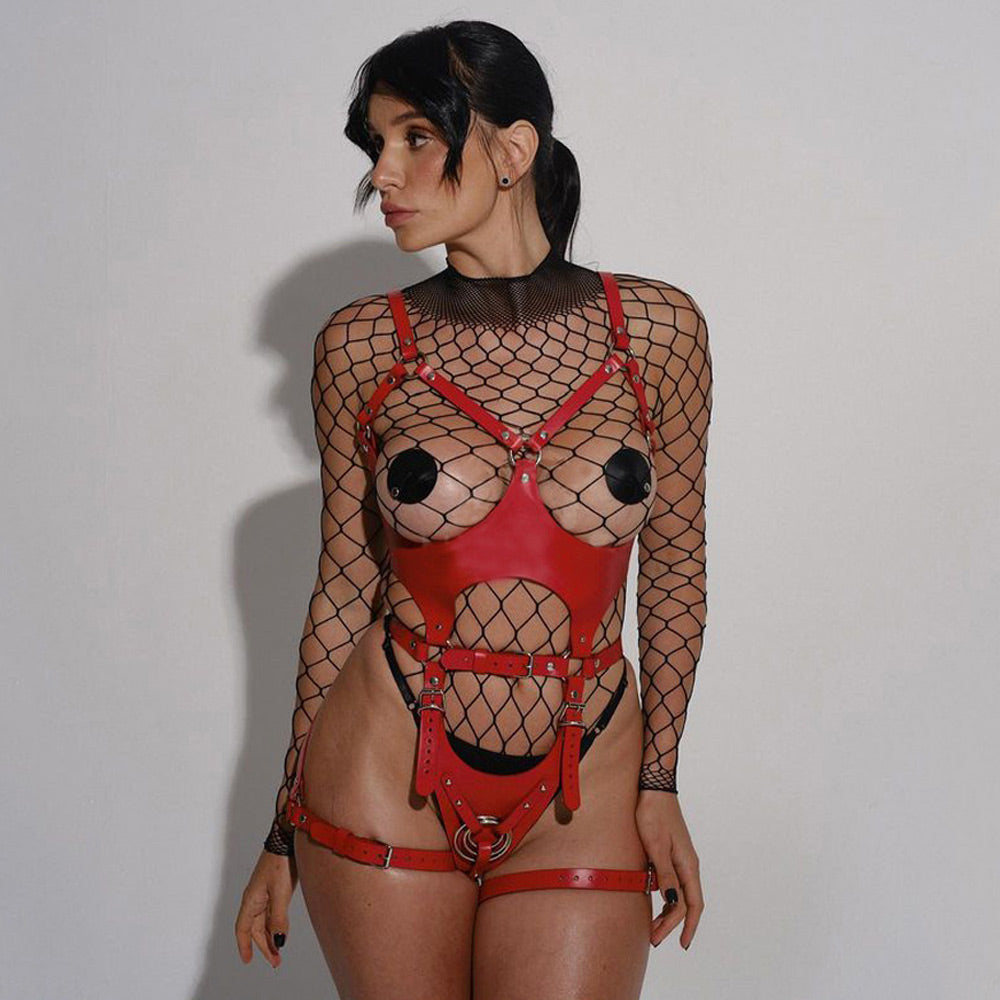 Design: This stunning exclusive harness featuring open cups with patent leather straps, silver stud embellishments, O-rings, an adjustable strappy bodice, an adjustable back band, an open crotch, and a thong cut back attached garter straps with wraparound leg garters, It's a sultry and sophisticated look that gives you complete control of your provocative style.