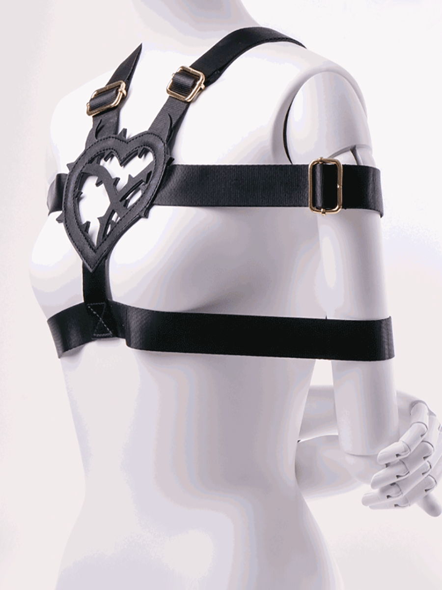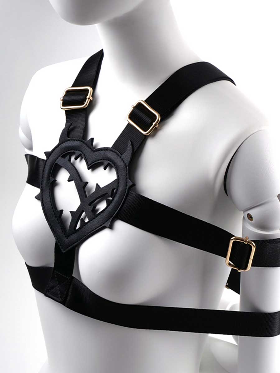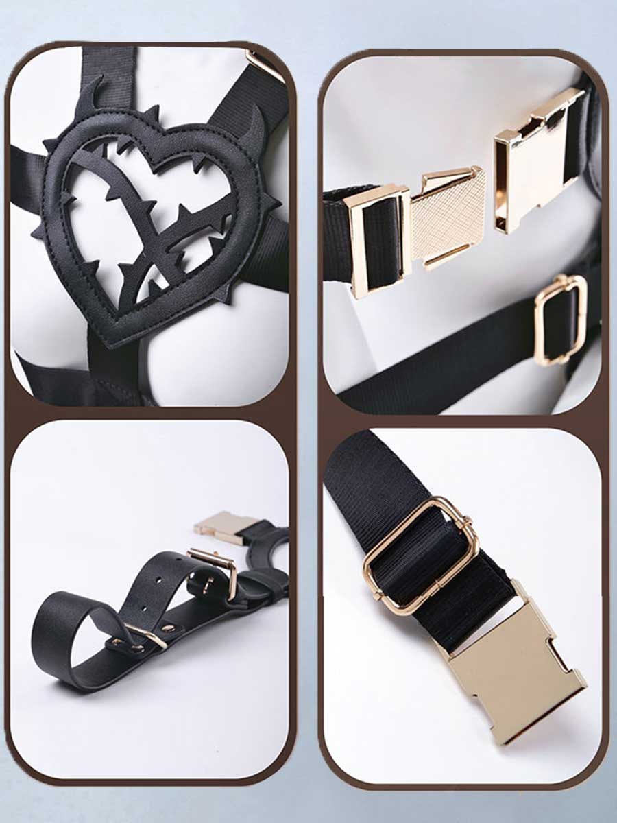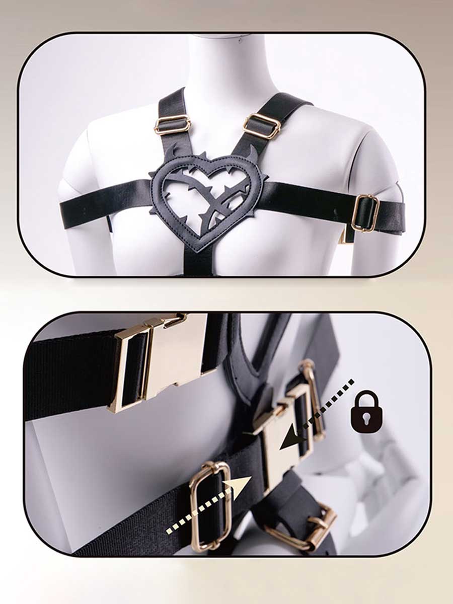 Design: Sexy leather harness top looks and feels like the real deal. It's the perfect accessory for a sleek and sexy look, featuring latex heart accents, and an adjustable back belt closure for a perfect fit every time.