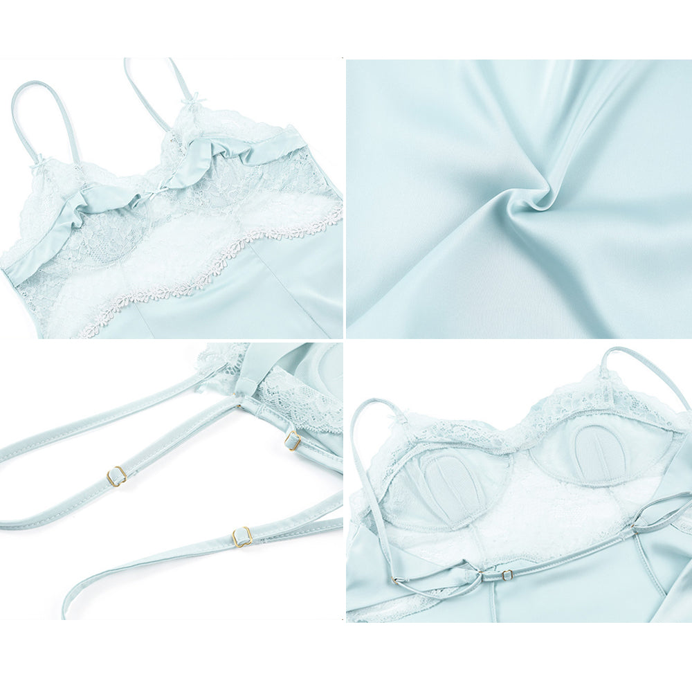 Design: This exclusive chemise featuring sheer lace cups with a ruffled trim, adjustable spaghetti straps, cute bow accents, a smooth satin bodice, and a back keyhole.