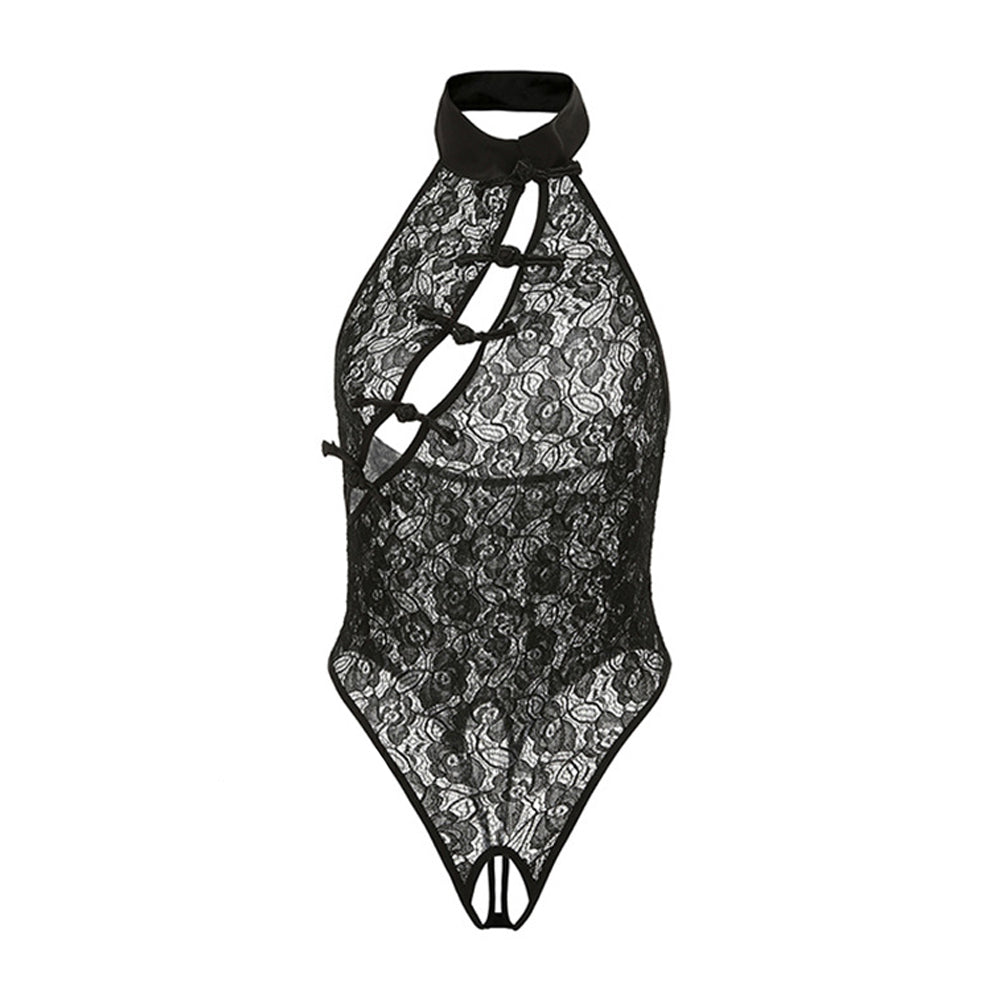 ランジェリー寝間着 セクシー中華風ブラック開股テディ ボディスーツレースベビードール