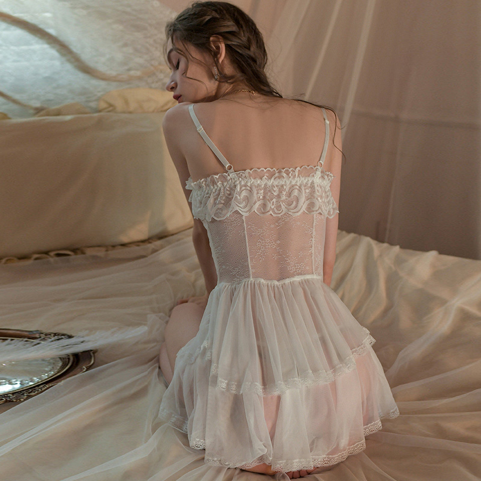 Design: This stunning mesh lingerie gown featuring lace ruched cups, front lace-up closure, adjustable spaghetti straps, a two-layered sheer mesh flirty skirt, and a matching t-string panty.