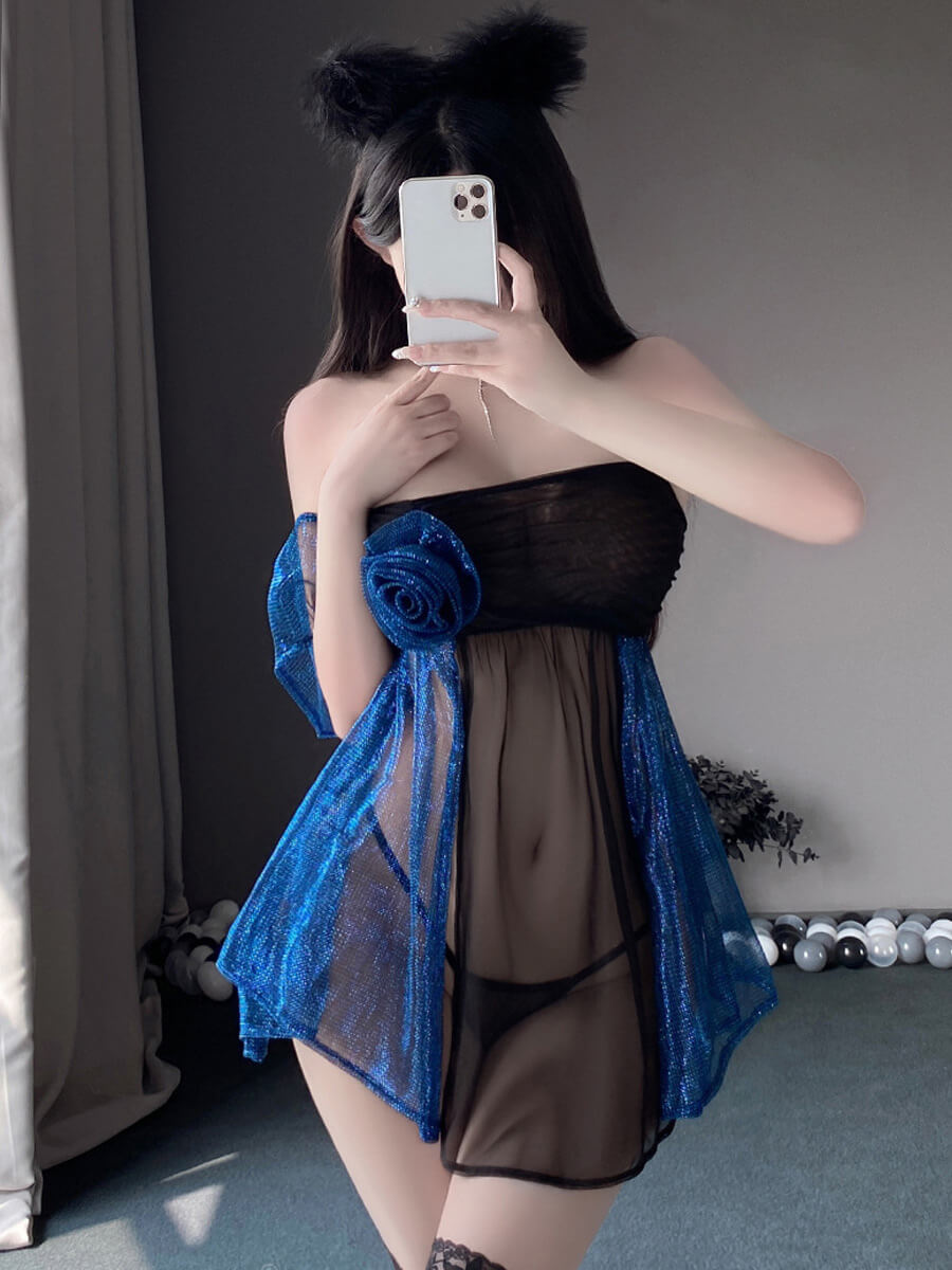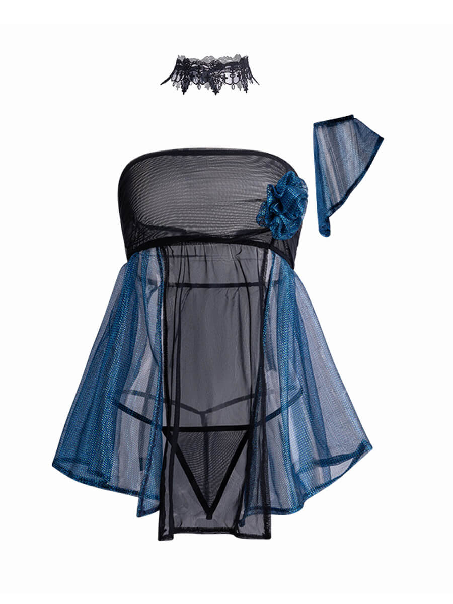 Design: Sexy Flyaway Babydoll Set featuring a sheer mesh strapless mini dress, a straight neckline and sheer split open mesh bodice, a blue mesh panels, a flyaway hemline, and a mini-length.