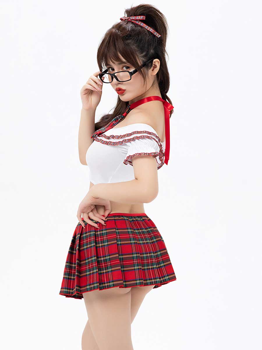Design: Asrrss sexy school girl lingerie featuring a white crop top, short sleeve with ruffled trim, for a great cosplay costume look.