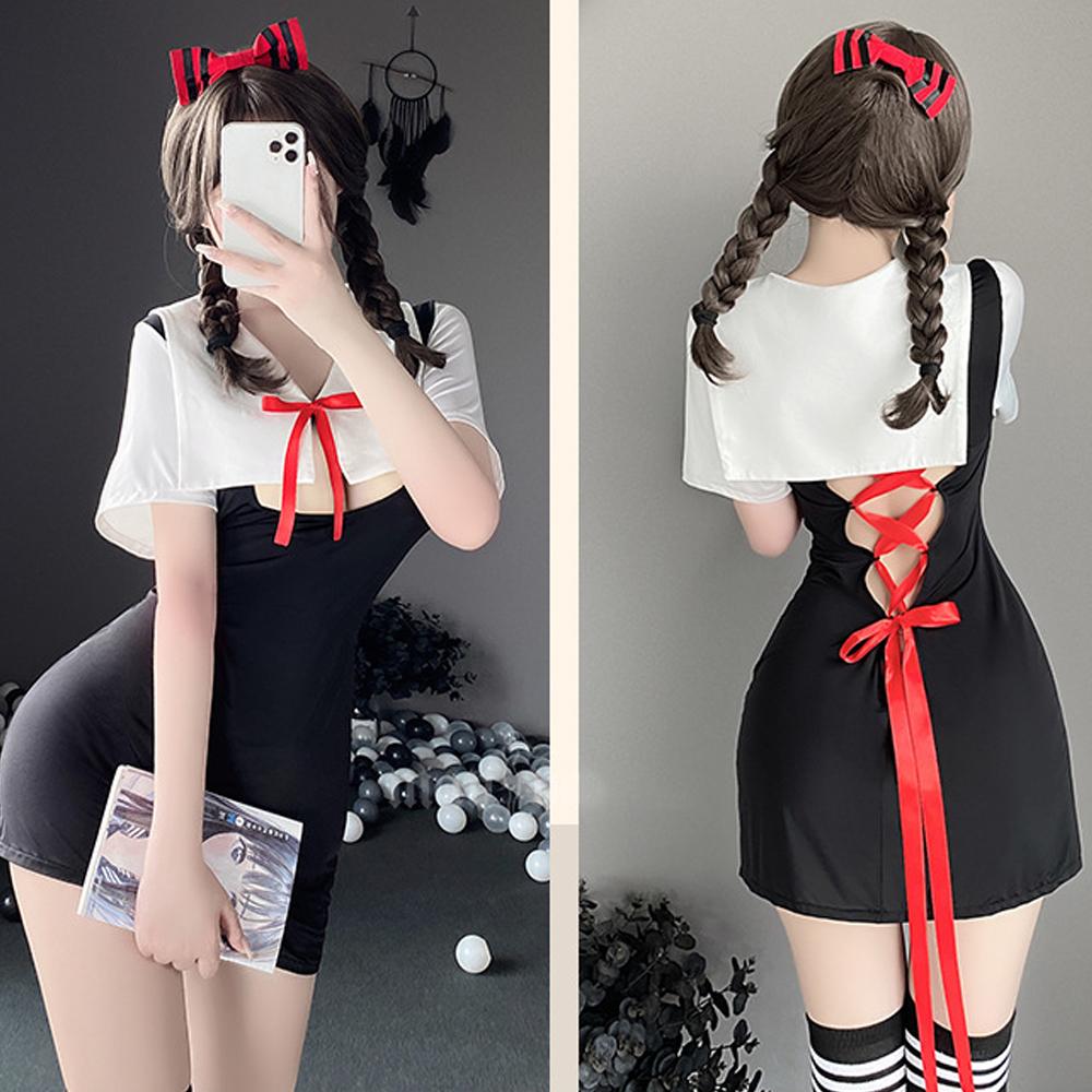 Design: Sexy School Girl Lingerie Dress featuring two-tone design, short sleeve, sailor lapel neckline with bust hollow out, front red bow decoration and back red lace up, makes you more attractive, shows off body curves.