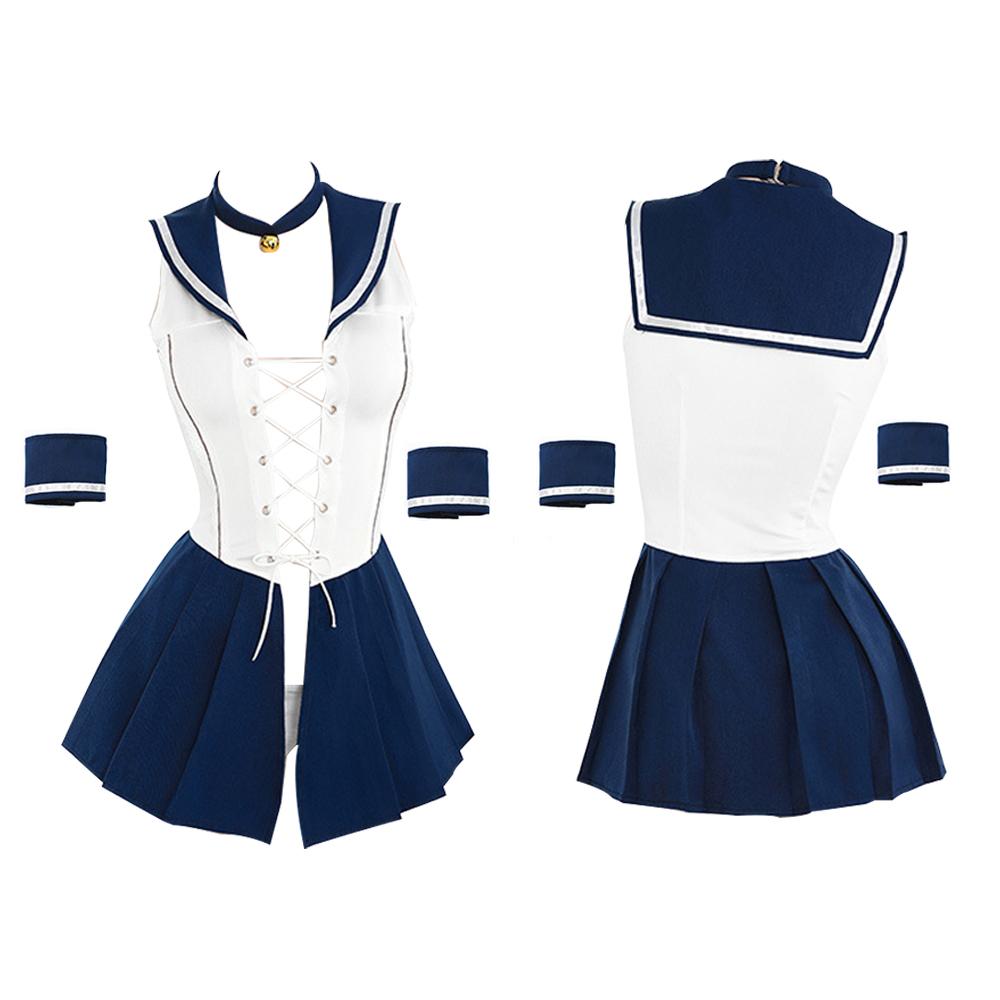 Design: Anime school girl lingerie featuring sailor lapel neckline, eyelet lace up with open front, it is easily adjustable to any sized. And attached pleated hem with slit details, which will make you looks more like a younger schoolgirl.
