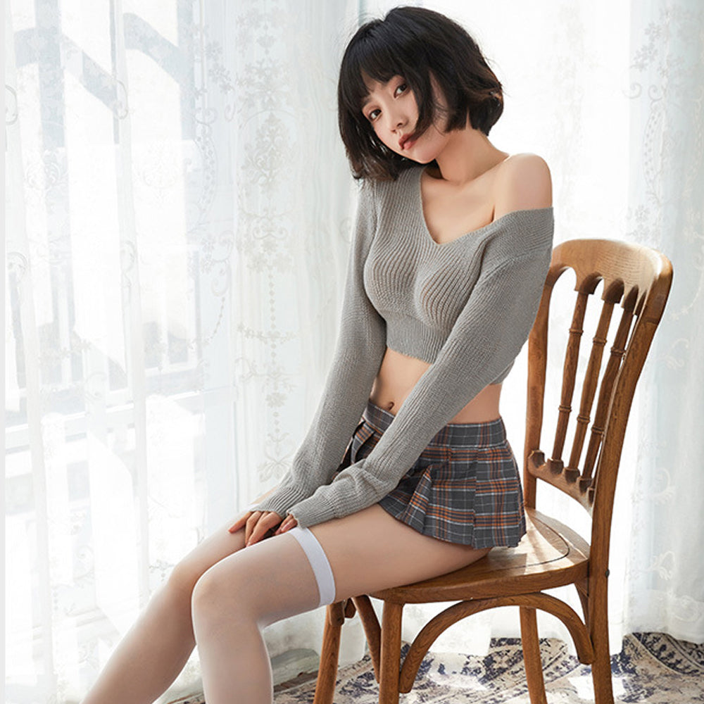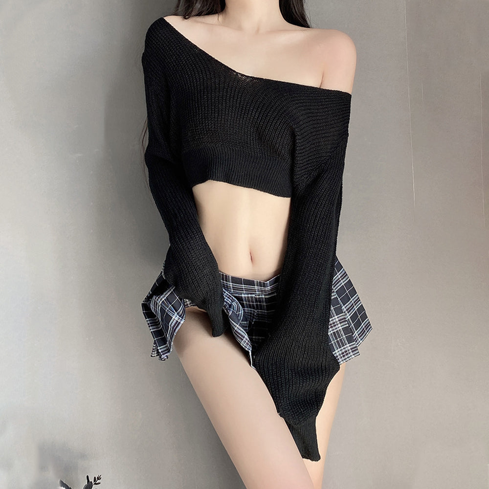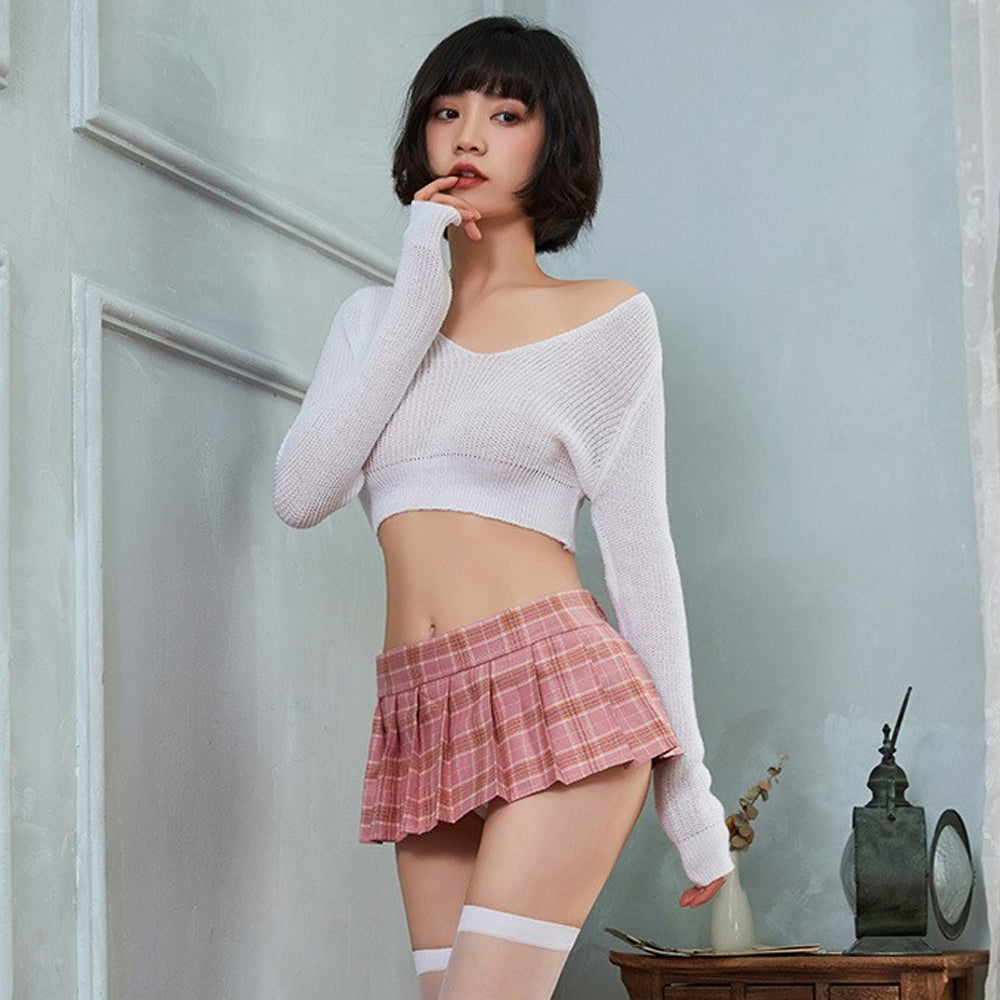 Design: Asrrss Anime School Girl Lingerie featuring a solid ribbed knit cardigan crop top, long sleeves, and a boat-style neck, a pleated mini skirt with a plaid print, a velcro closure, makes you more lovely and charming.