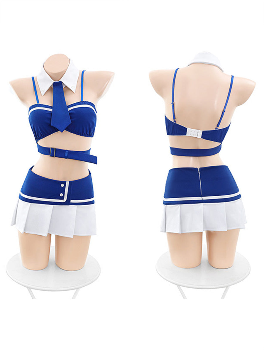 Design: This School Cheerleader Costume is sure to turn heads. The blue crop top features ruched bust, adjustable spaghetti straps, a back hook and eye closure, Underband with buckles decoration, just cover the breast length, And a matching pleated skirt, back zipper up closure, giving you the flexibility to dance your heart out.