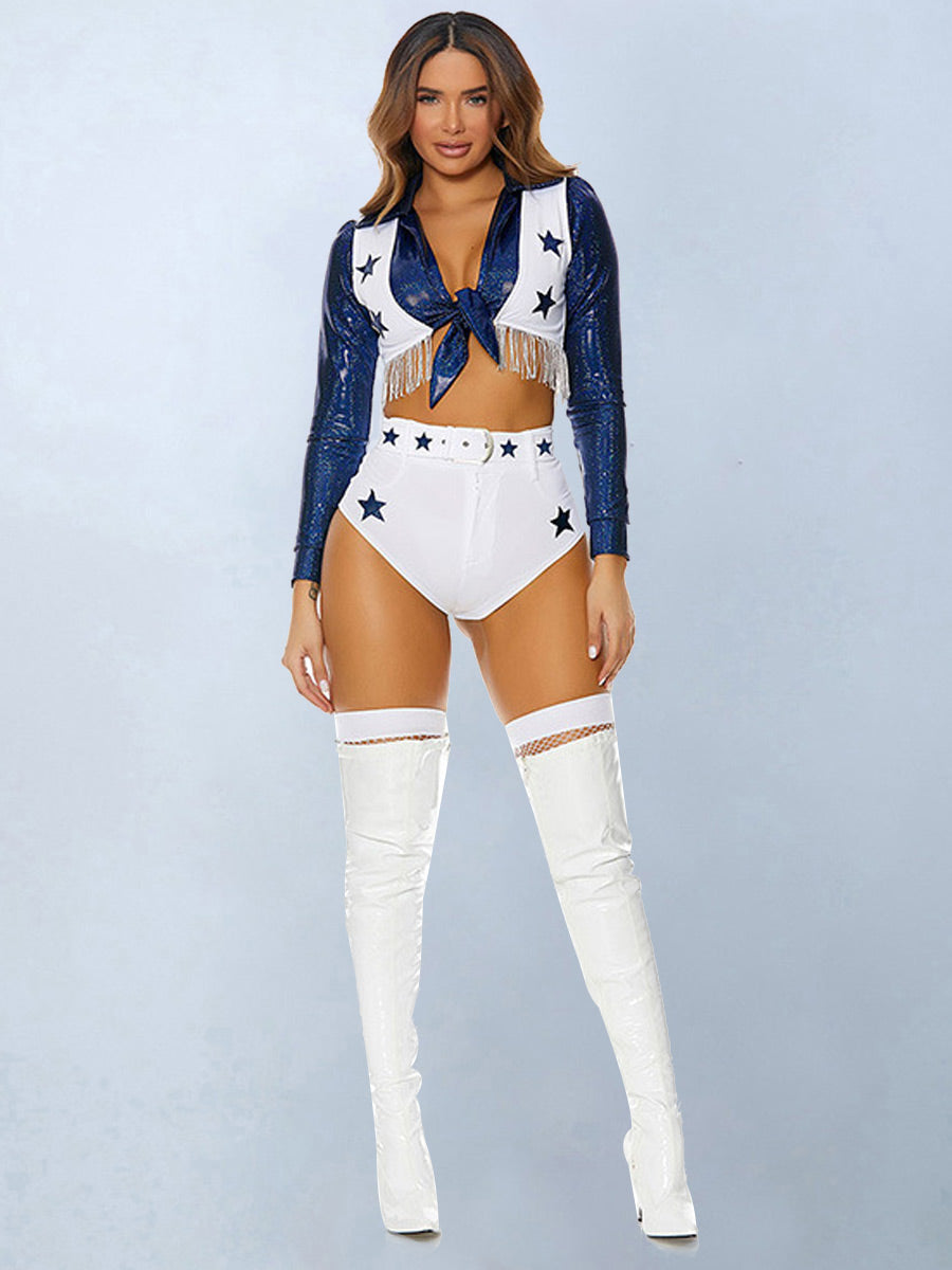 Product SPU: CS2L15415 Brand: Asrrss Color: Blue/White Material: Polyester Size: S, M, L, XL, XXL, XXXL Weight: Recommended weight for 88-154lbs Pattern: Star Type: Neckline: Lapel Neck Sleeve Length: Long Sleeve Design: This cowboys cheerleader costume featuring a blue tie top crop, an attached white vest with a fringe trim and stars print, a matching bottom, and a belt with star accents, It's a fashionable and playful option for game day. Embrace your team's colors and show your support with this cowboys cheerleader costume. Occasion:Sexy cheerleading uniform is suitable for Sport show, photography, cosplay party, theme party, night club wear, Halloween Party, Valentine's day, Christmas Party, honeymoon, ball game, stage and soon. Package Including:1x Top+1x Shorts+1x Belt