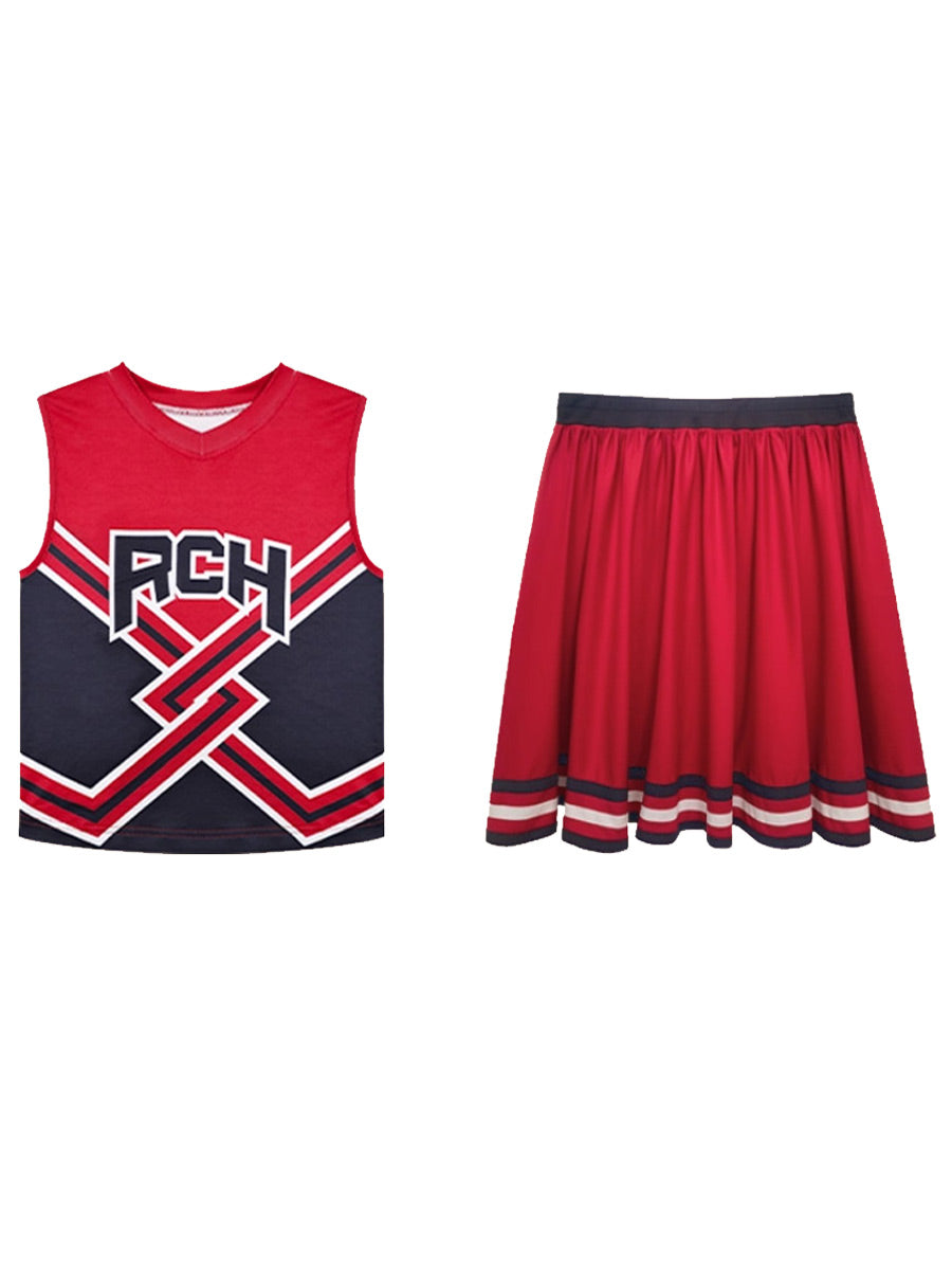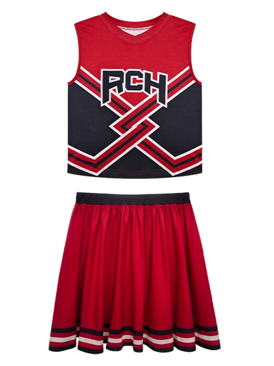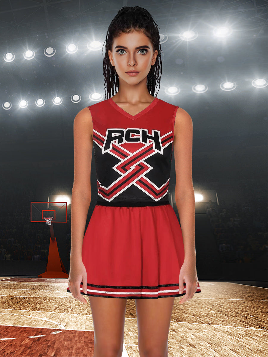 Design: This Bring It Cheer costume featuring a red V-neck crop top with "RCH" logo, and a matching pleated high waist skirt with striped hem, It's the perfect choice for a standout performance.