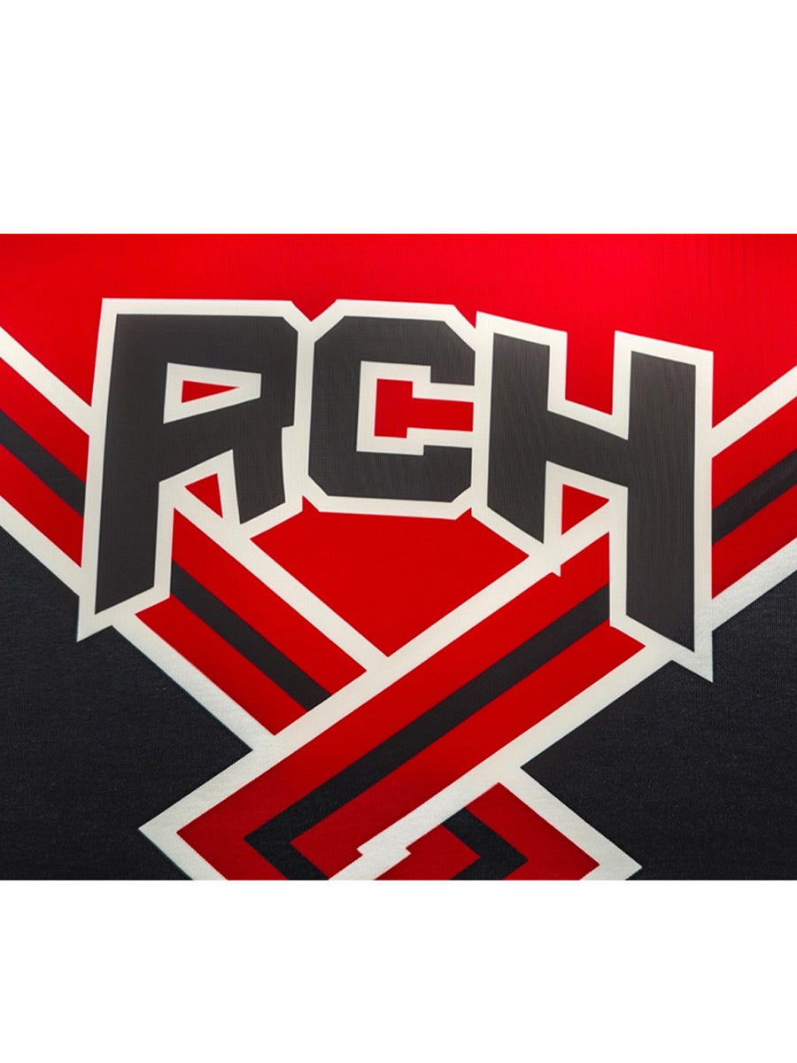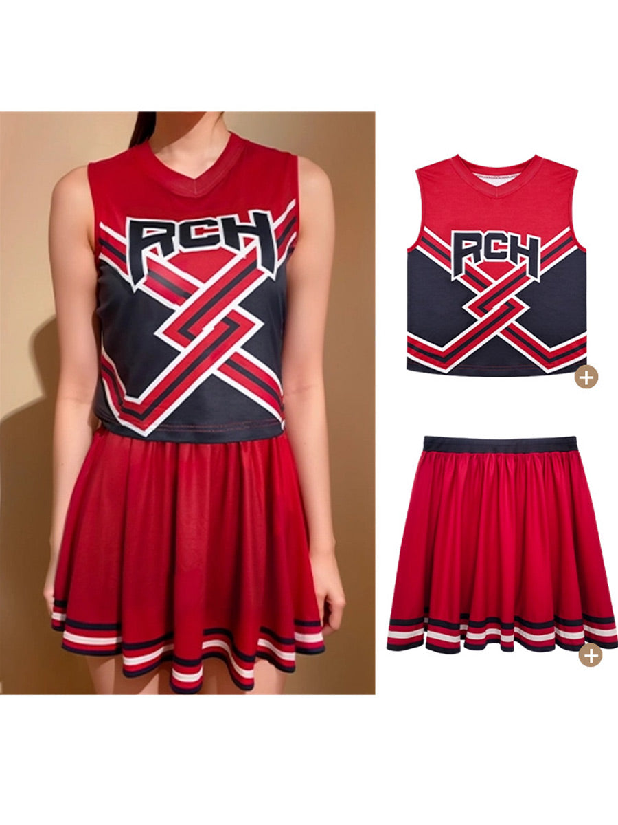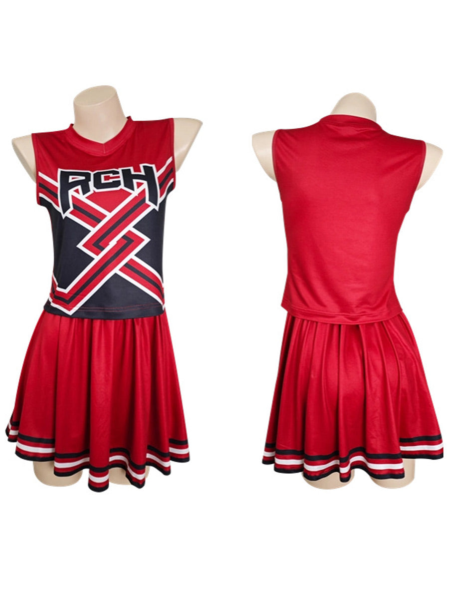 Design: This Bring It Cheer costume featuring a red V-neck crop top with "RCH" logo, and a matching pleated high waist skirt with striped hem, It's the perfect choice for a standout performance.