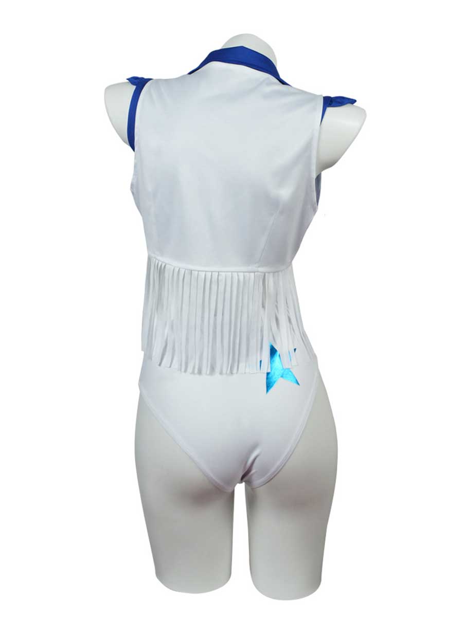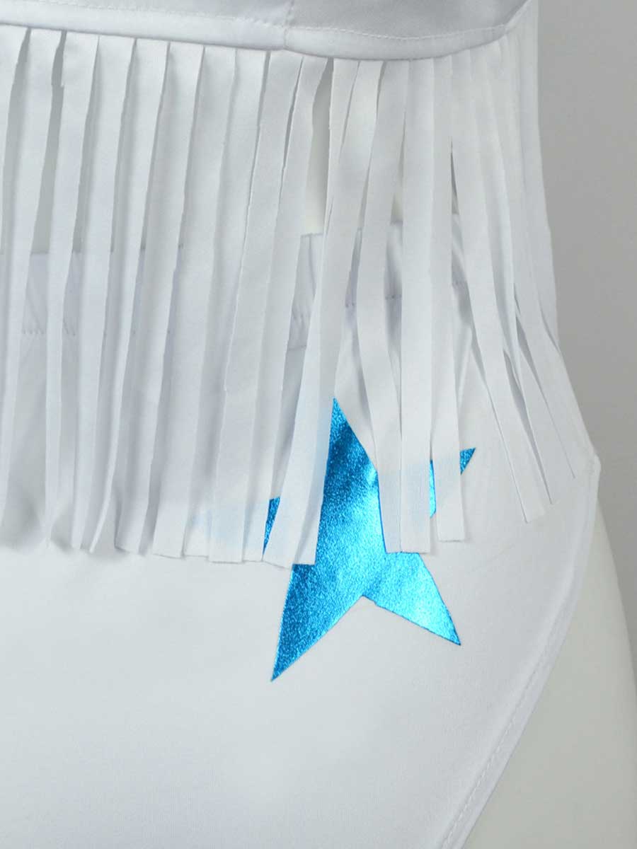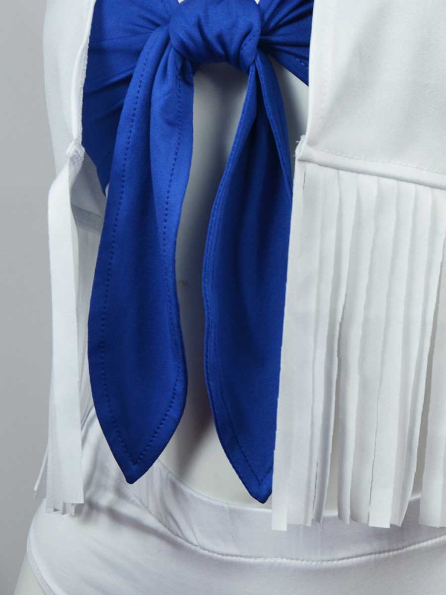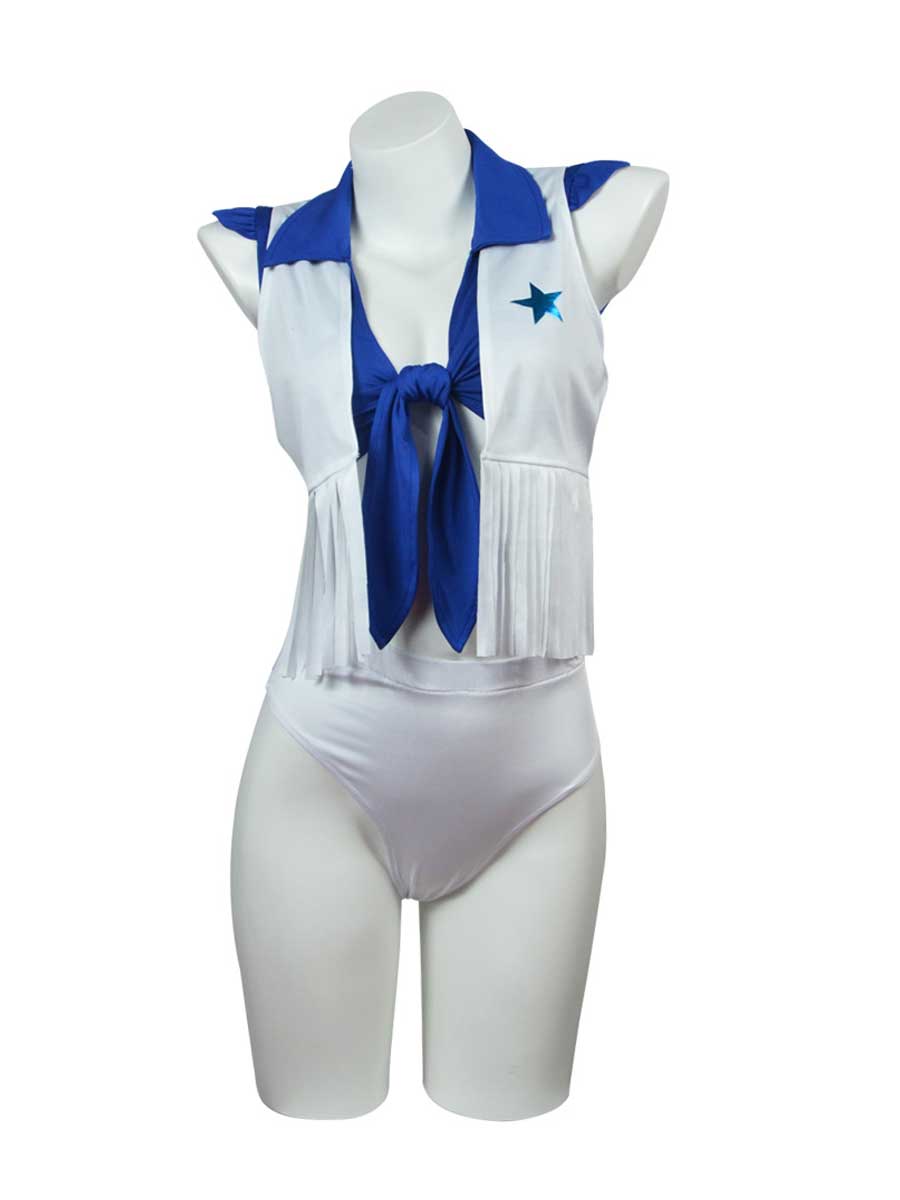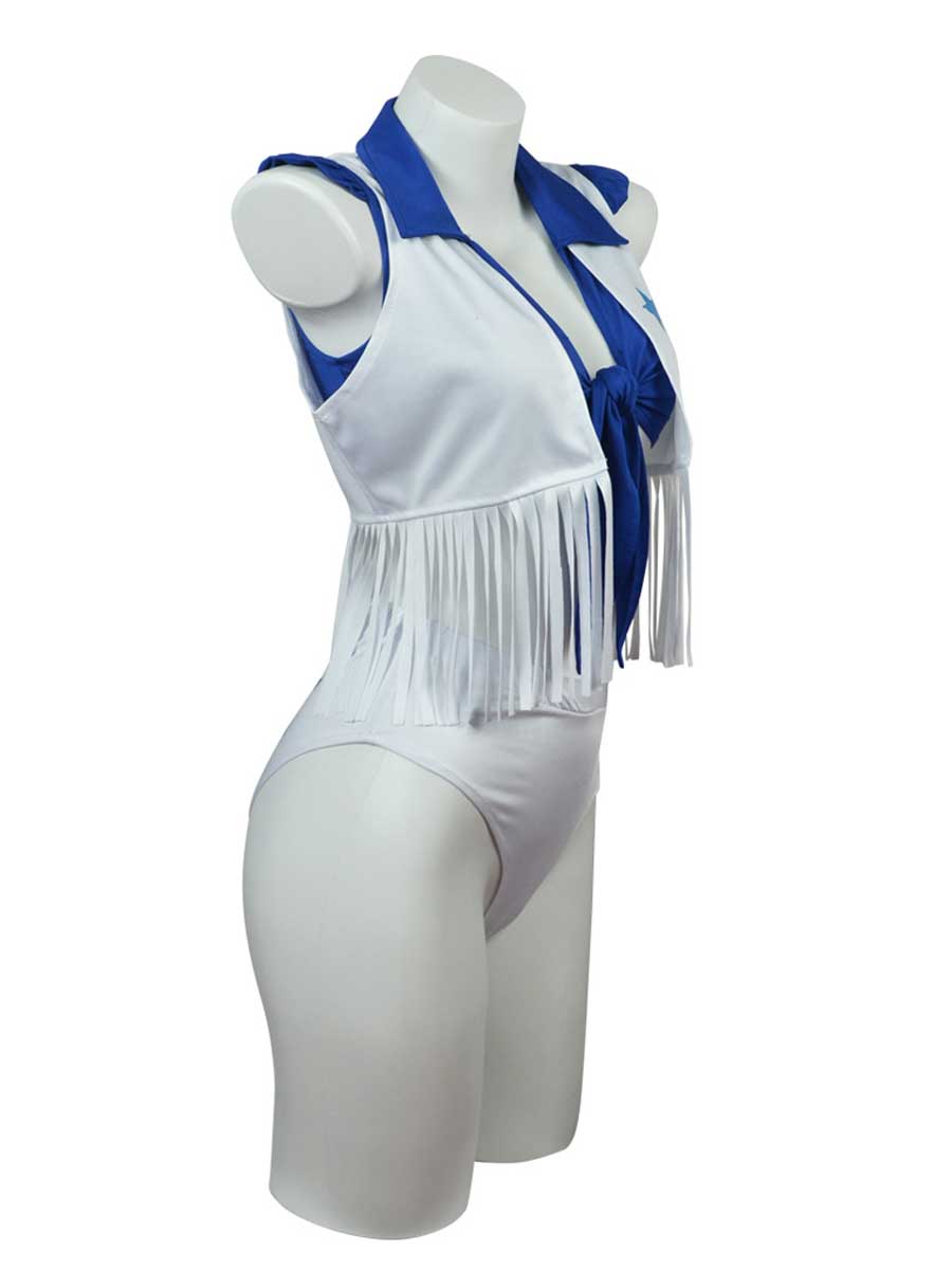 Design: This cowboys cheerleader costume featuring a blue crop top with a front tie closure, a white vest with star patches and a fringe trim, low-rise white shorts, It's a fashionable and playful option for game day. Embrace your team's colors and show your support with this cowboys cheerleader costume.