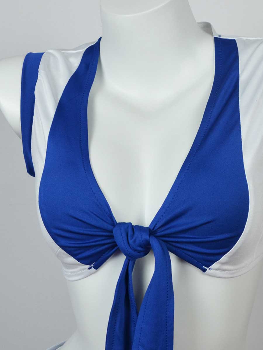 Design: This cowboys cheerleader costume featuring a blue crop top with a front tie closure, a white vest with star patches and a fringe trim, low-rise white shorts with a white belt, It's a fashionable and playful option for game day. Embrace your team's colors and show your support with this cowboys cheerleader costume.