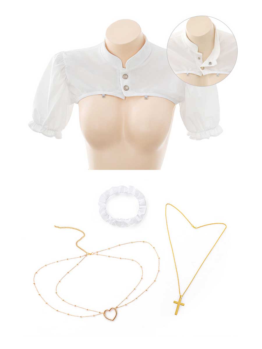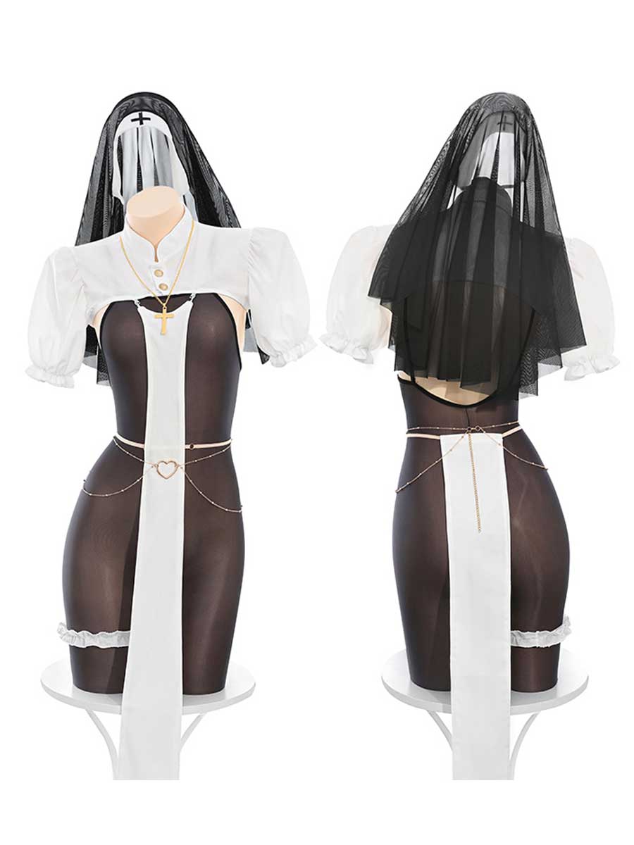 Design: This nun habit costume featuring a balck sheer bodystocking with open crotch design, making it both sexy and practical. A white cropped shrug, short puff shleeves, and a draping front and back panel. With this outfit, you'll feel confident and alluring, no matter the occasion.