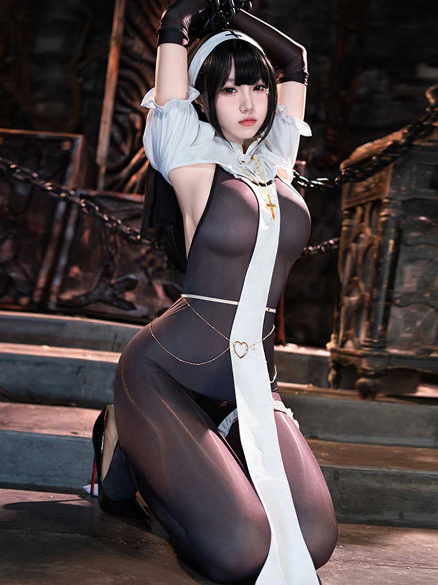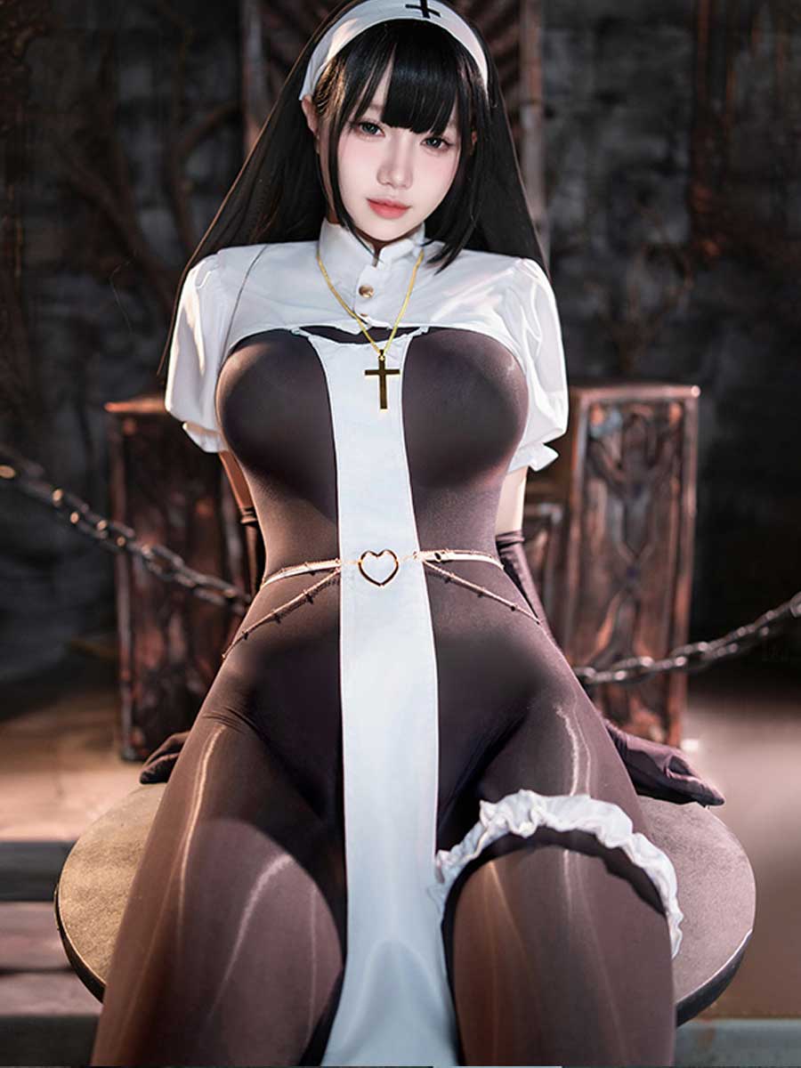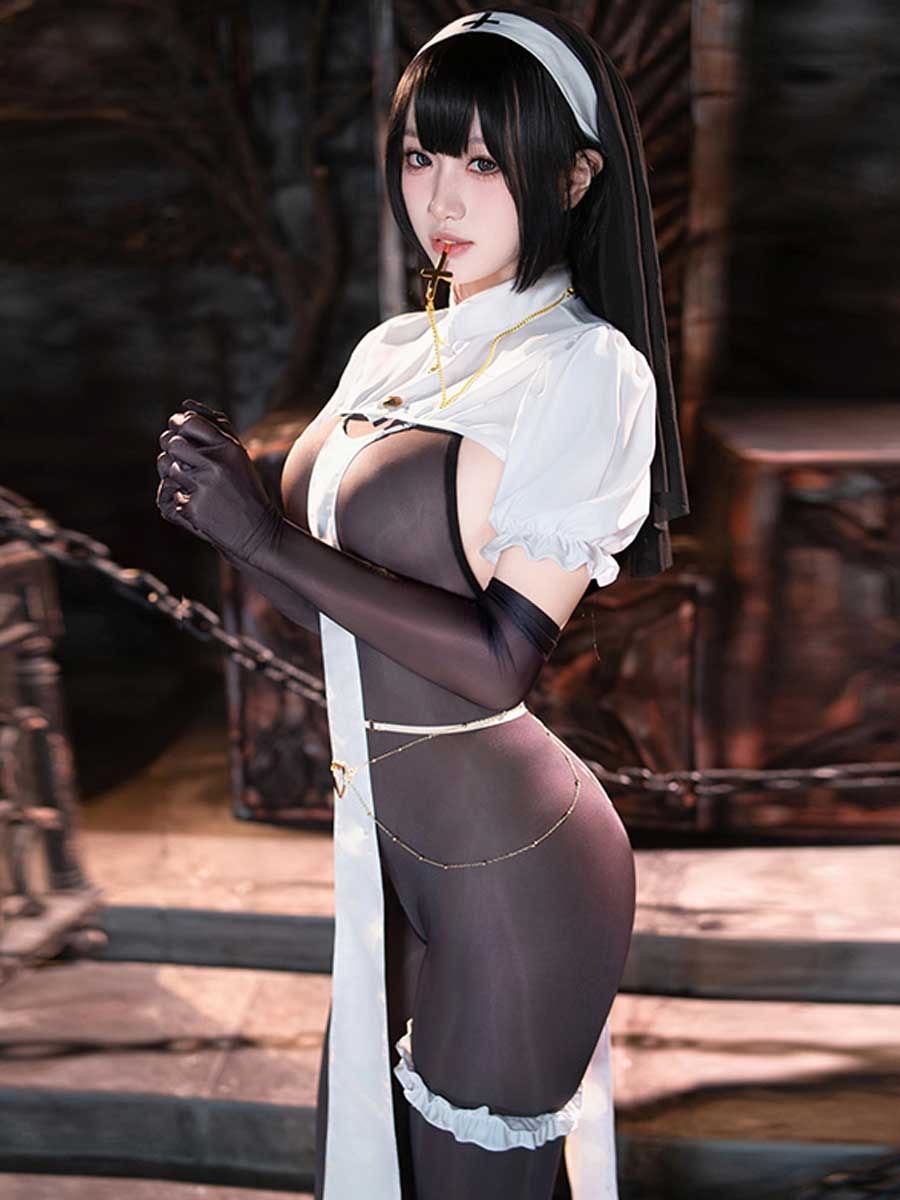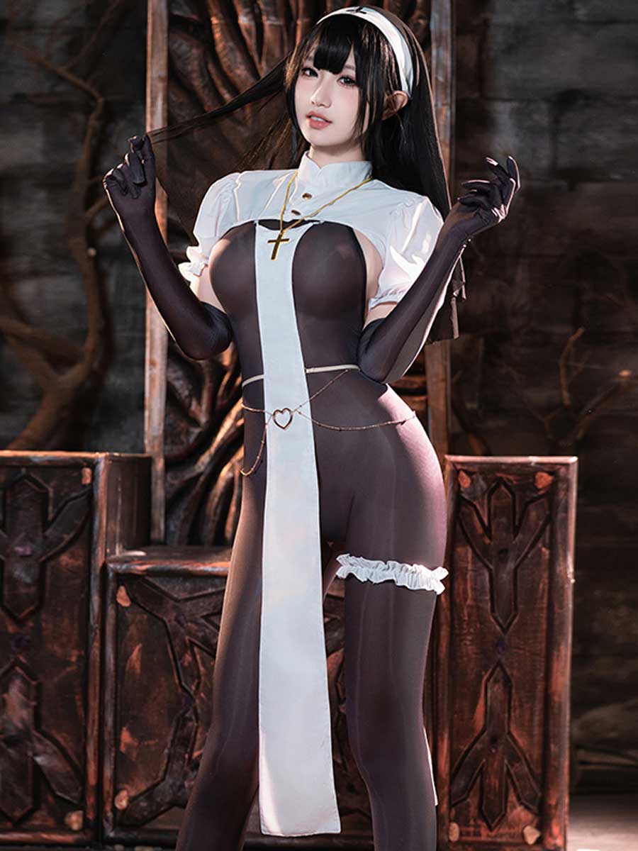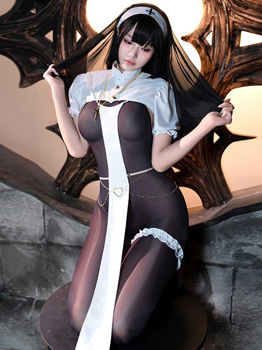 Nun Full Set: 1* Bodystocking+1* Habit Headpiece+1* Shrug+1* Necklace+1* Thing Ring+1* Waist Chain+1* Detachable Skirt+1 pair of Gloves