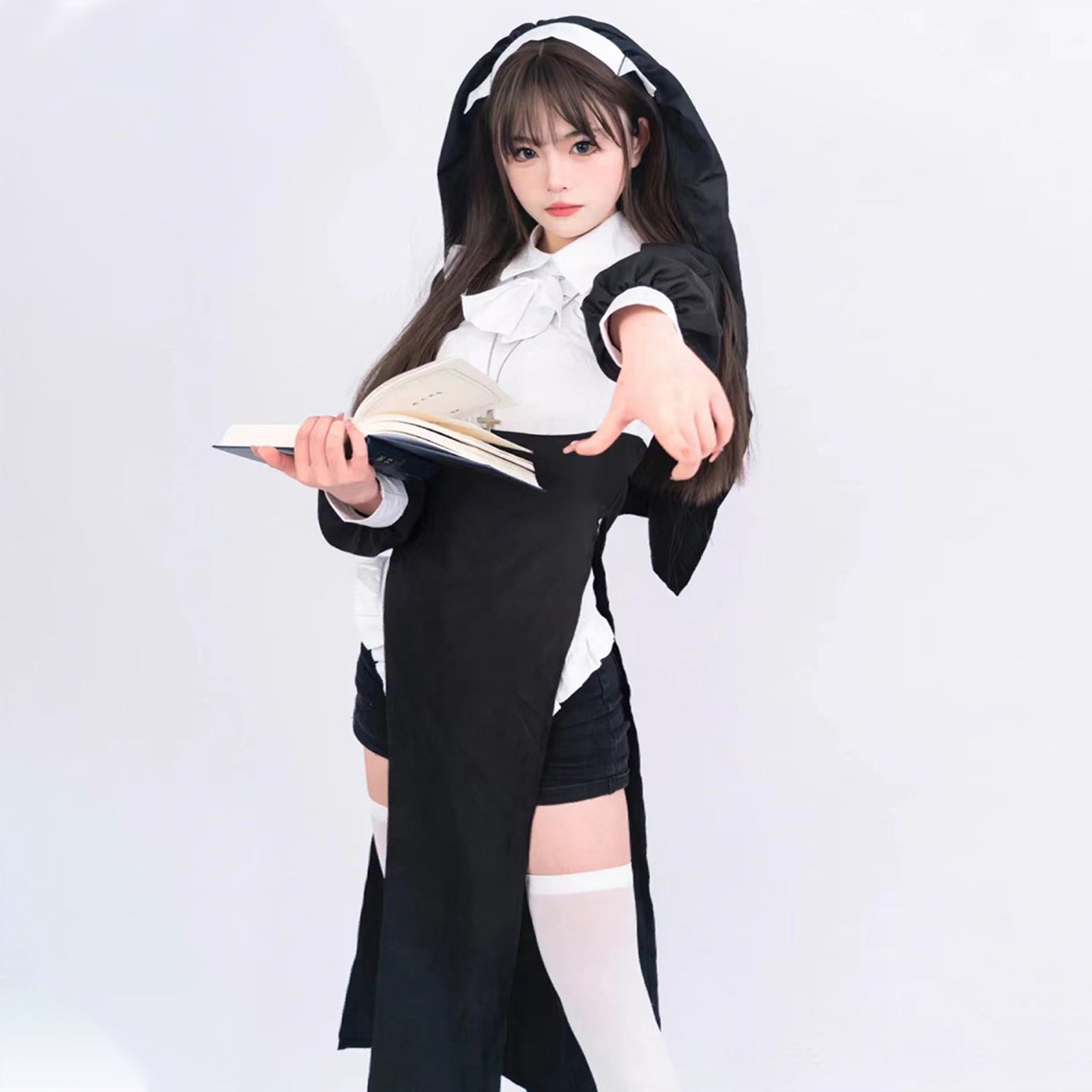 Product SPU: CS2L14792Brand: AsrrssColor: BlackMaterial: PolyesterSize: S, M, L, XLWeight: Recommended weight in 88-132lbsPattern: Color BlockType: Neckline: Lapel Neck Sleeve Length: Long SleeveDesign: This nun habit costume featuring a black maxi length dress with high slits, a white priestly collar with white neck tie accents, long bishop sleeves, a black shorts, and a matching nun habit veil.