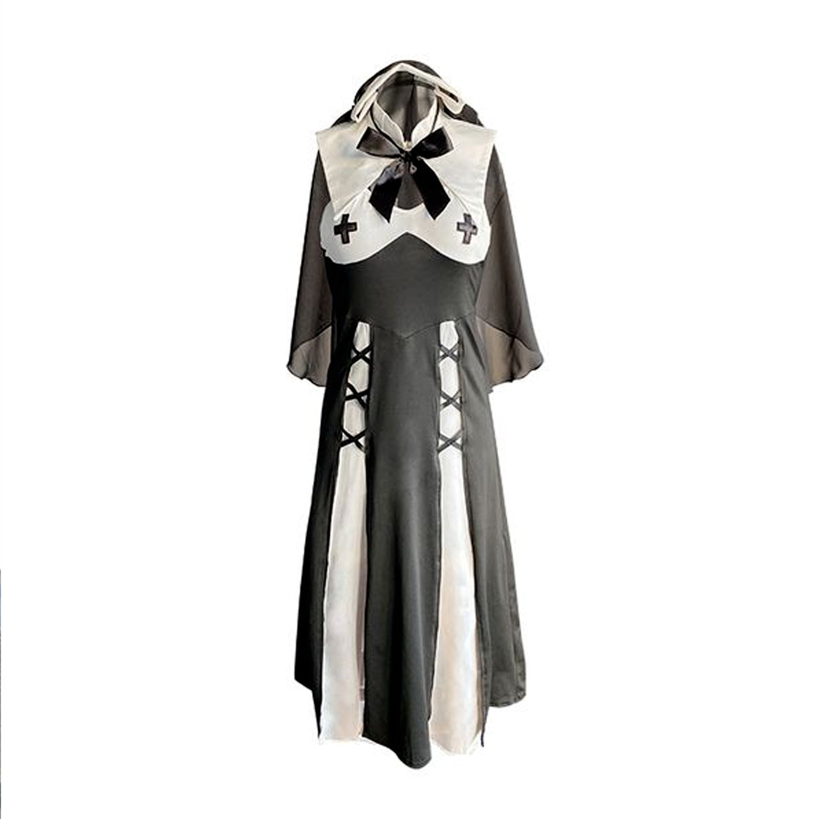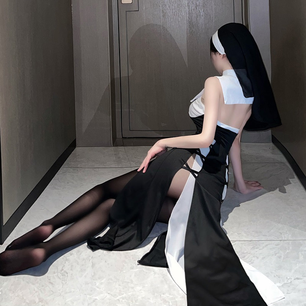 Design: This nun habit costume featuring a black maxi length dress with high slits, a white priestly collar with satin bow accents, cross symbol at bust, cross hip details, and a nun habit veil.