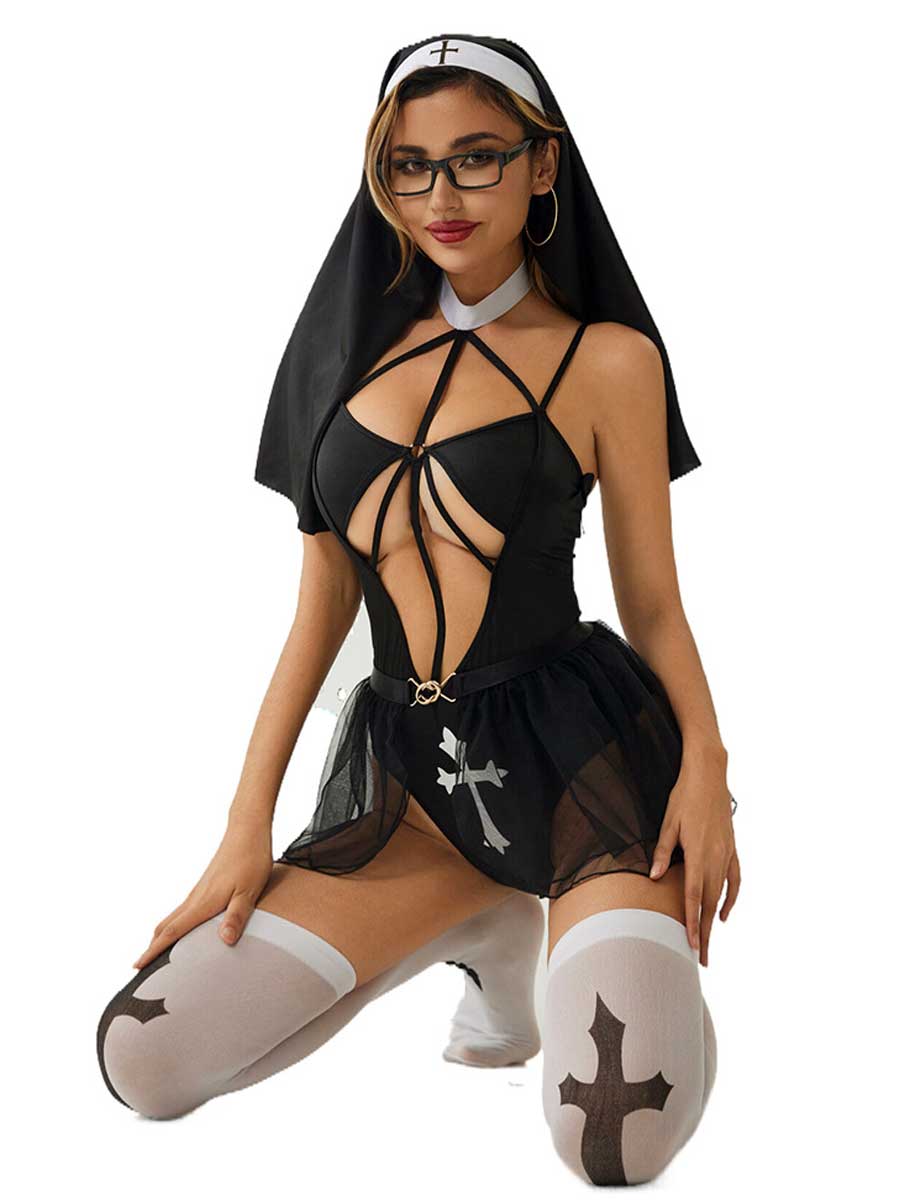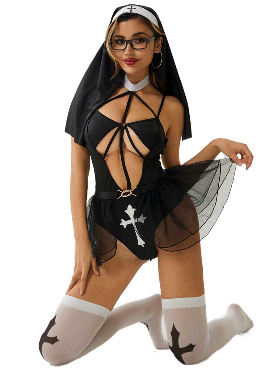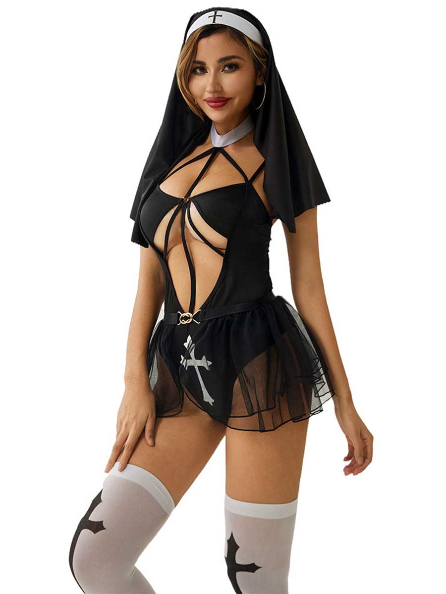 Product SPU: CS2L15838Brand: AsrrssColor: BlackMaterial: PolyesterSize: S, M, LWeight: Recommended weight in 88-132lbsPattern: CrossType: Neckline: Spaghetti StrapsSleeve Length: SleevelessDesign: This sexy nun habit costume featuring a hollow out teddy with strappy chest details, metal O-ring accents, a halter neck strap, adjustable spaghetti straps, a white cross print, a thong cut back, a mesh tutu skirt, and a matching habit. Occasion: Slutty nun costume is perfect for nightwear, wedding night, honeymoon, Valentine's Day, anniversary, halloween outfit, lingerie party, party dresses, photograph clothing, anime cosplay, gift or every hot nigh.