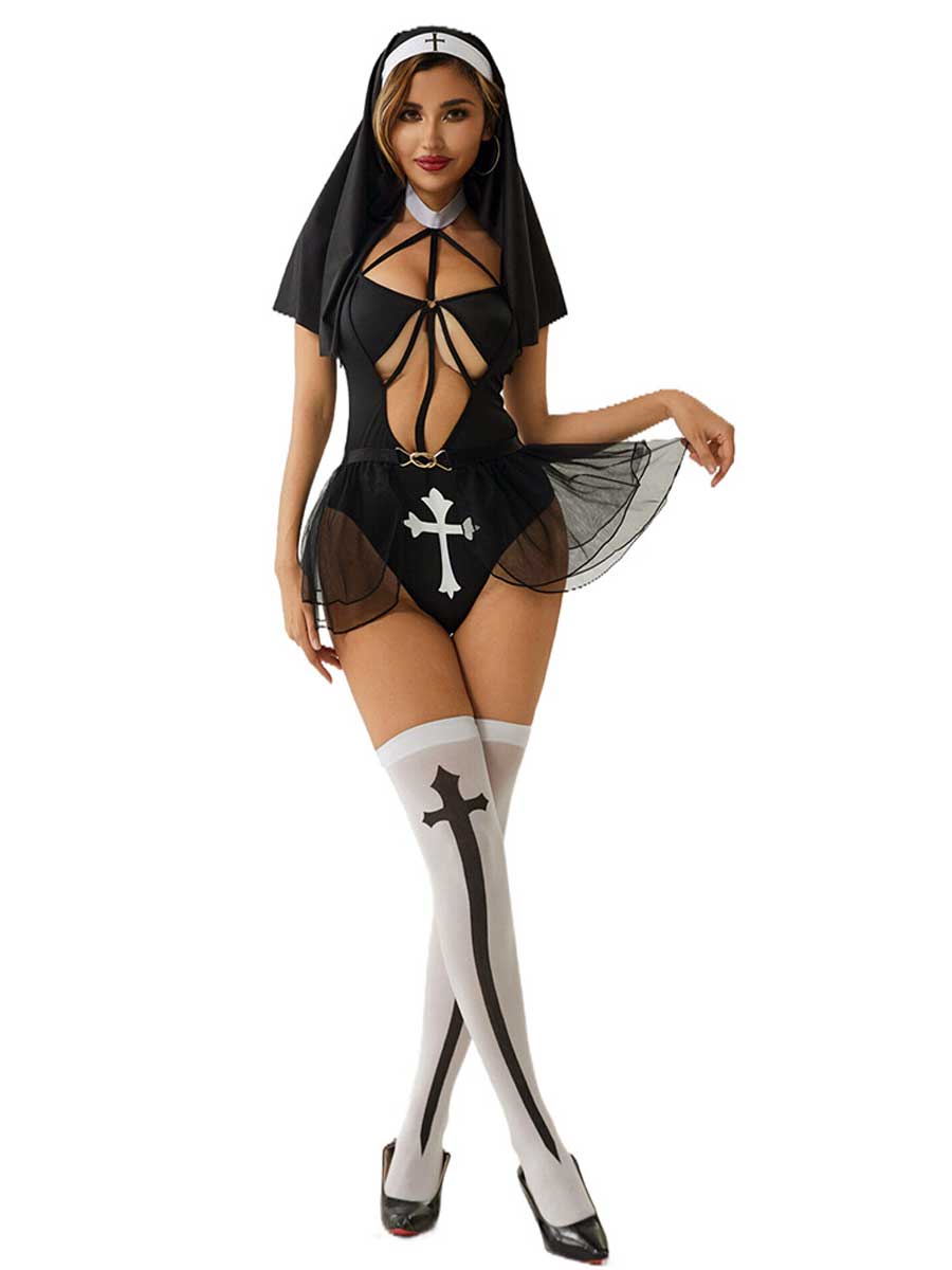 Package Including: 1* Nun Bodysuit+1* Habit Headpiece+1* Mesh Skirt+1 pair of Stocking