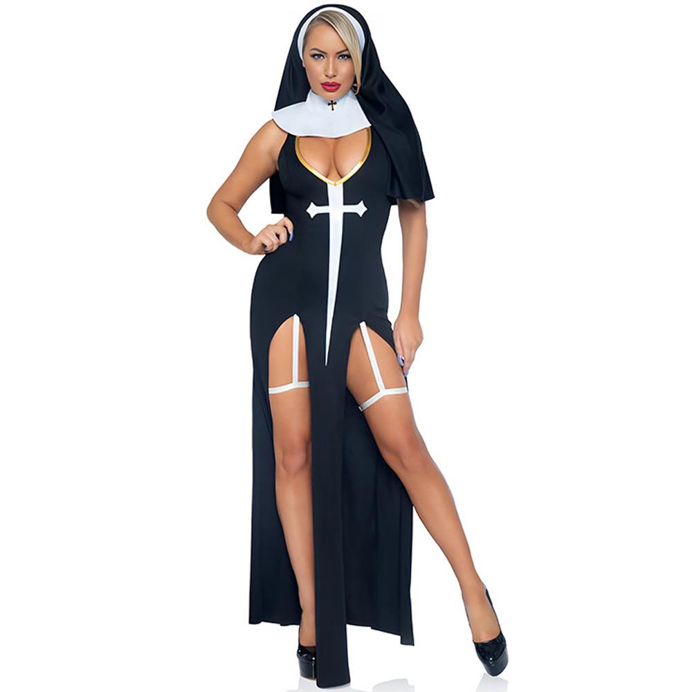Product Details Product SPU: CS2L15008 Brand: Asrrss Color:Black Material: Polyester Size:S, M, L Weight: Recommended weight in 88-132lbs Pattern: Cross Type: Neckline: Collar Sleeve Length:Sleeveless Design: This slutty nun halloween costume featuring a black dress with high slits, attached garter straps with wraparound leg garters, a front white cross detail, a collar, and a matching nun habit. Perfectly crafted for an authentic look, this costume is sure to be a hit at your next event. Occasion:Slutty nun costume is perfect for nightwear, wedding night, honeymoon, Valentine's Day, anniversary, halloween outfit, lingerie party, party dresses, photograph clothing, anime cosplay, gift or every hot nigh. Package Including: 1* Nun Dress+1* Habit Headpiece+1* Collar+1* Panty