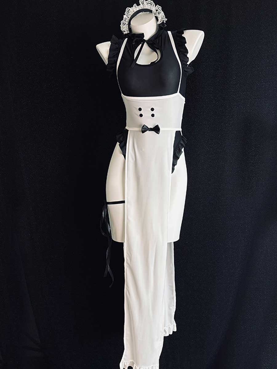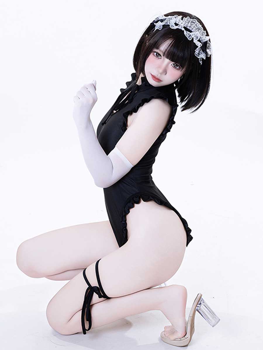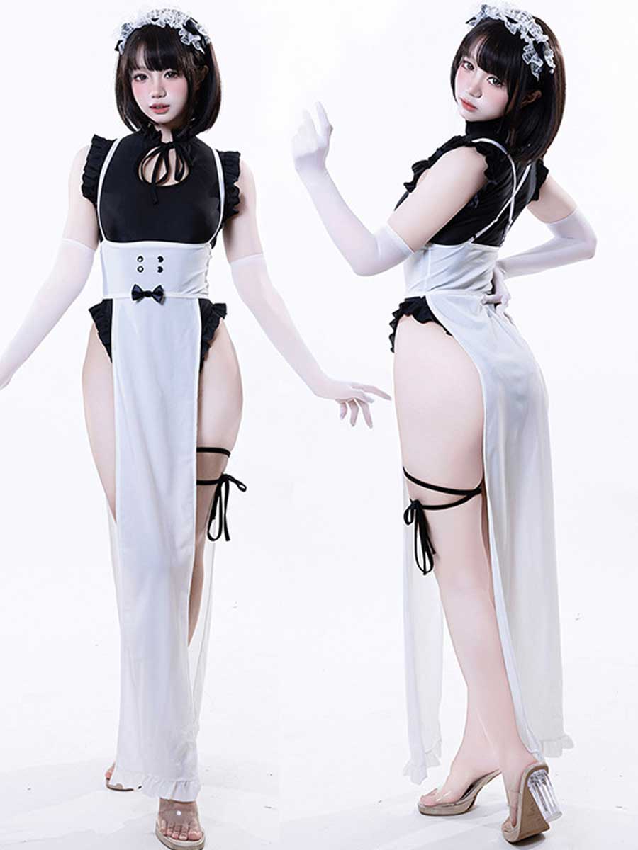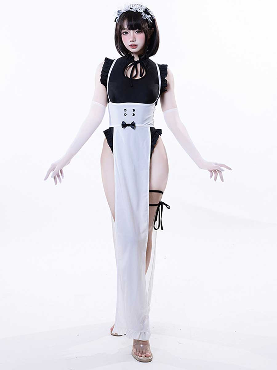 Design: Sexy Maid Cosplay Costumes featuring black bodysuit with ruffled trim, and a matching apron with adjustable suspenders, front and back draping panels.
