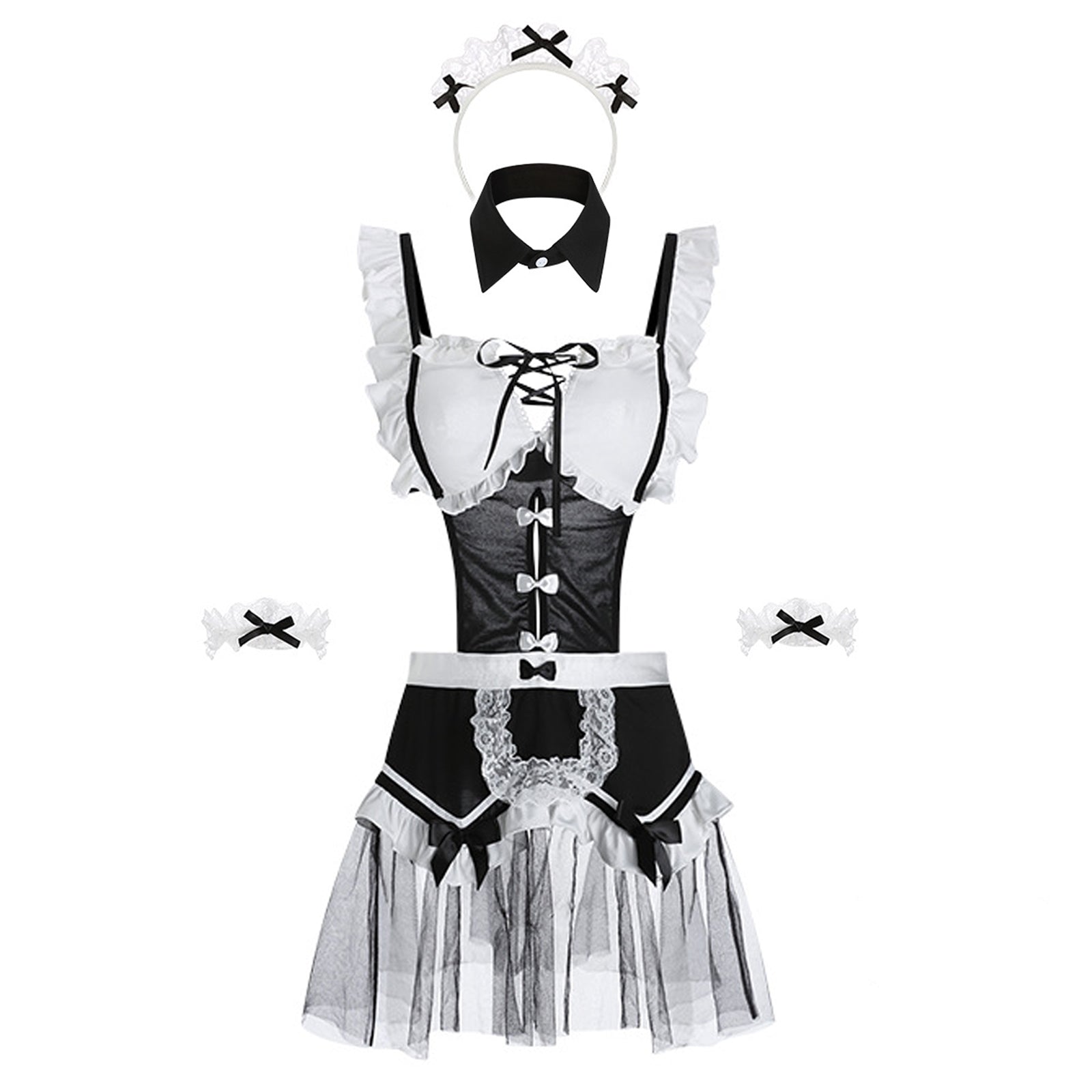 Design: Asrrss sexy maid cosplay lingerie featuring a mini dress, black ribbon lace-up detailing at bust, adjustable spaghetti straps with ruffled detailing, a hook and eye back closure, a black cut-out bodice with satin bow accents, a black mini skirt with a black tulle hem.