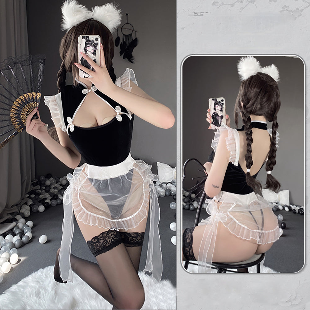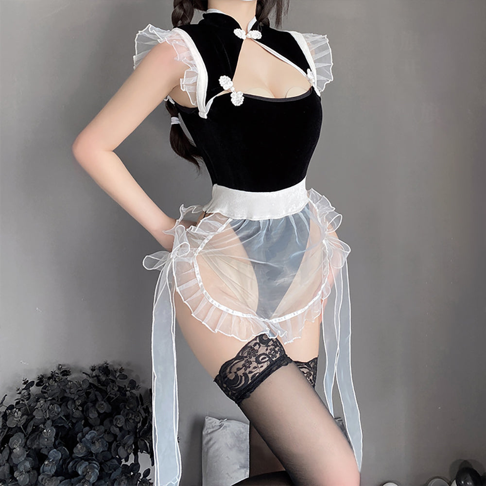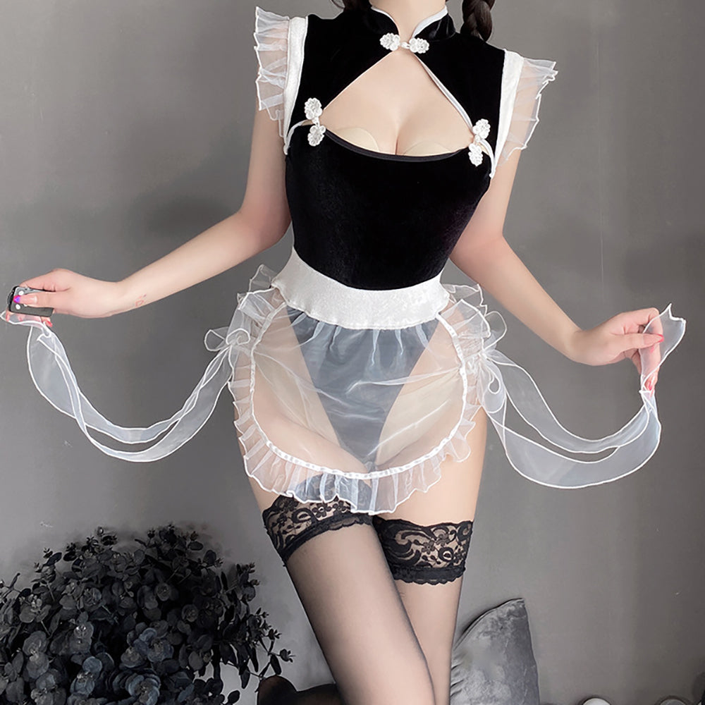 Design: This sexy anime maid lingerie featuring stand collar with traditional buckle, a keyhole cut-out, sleeveless with mesh ruffled trim, a sheer mesh skirt with side knot accent, and a cheeky cut bottom.