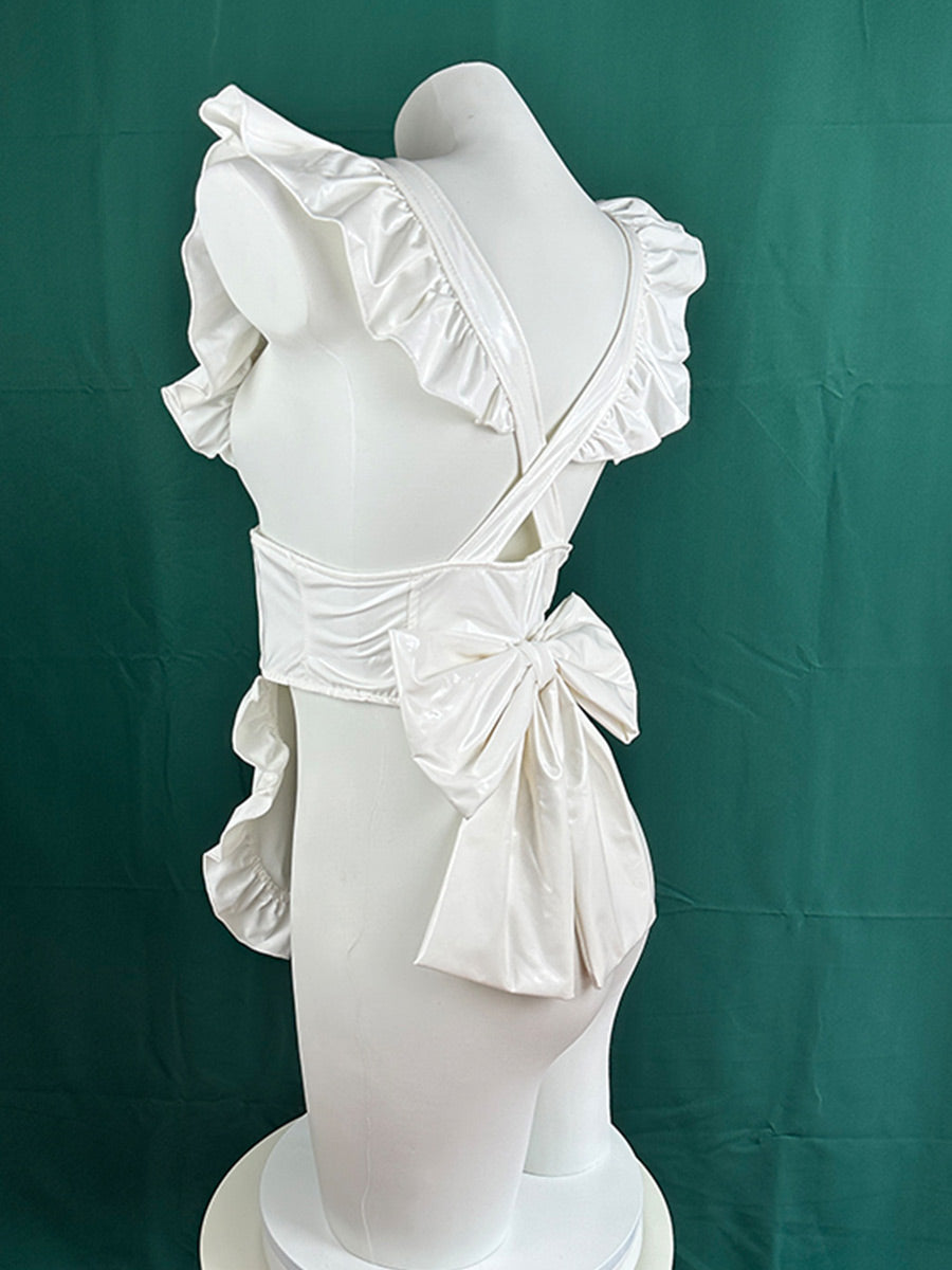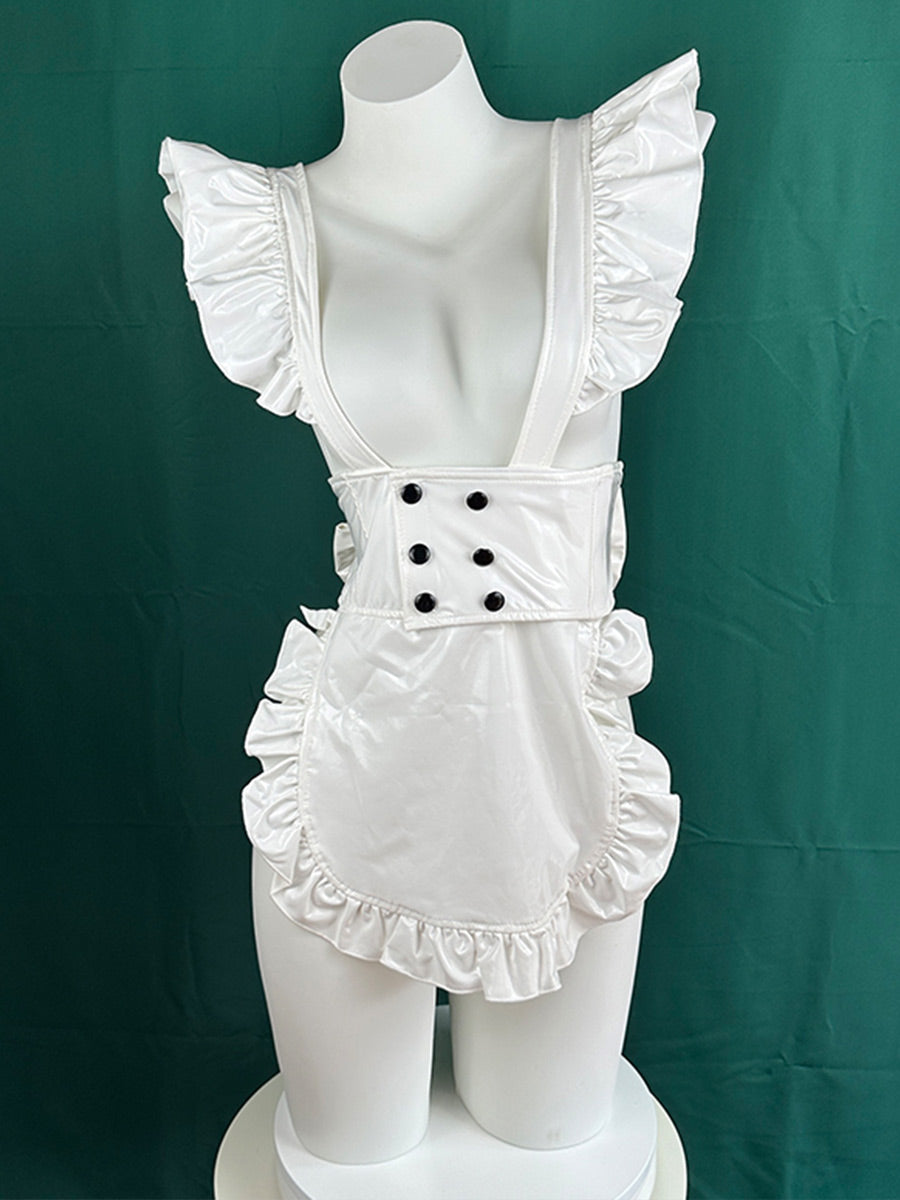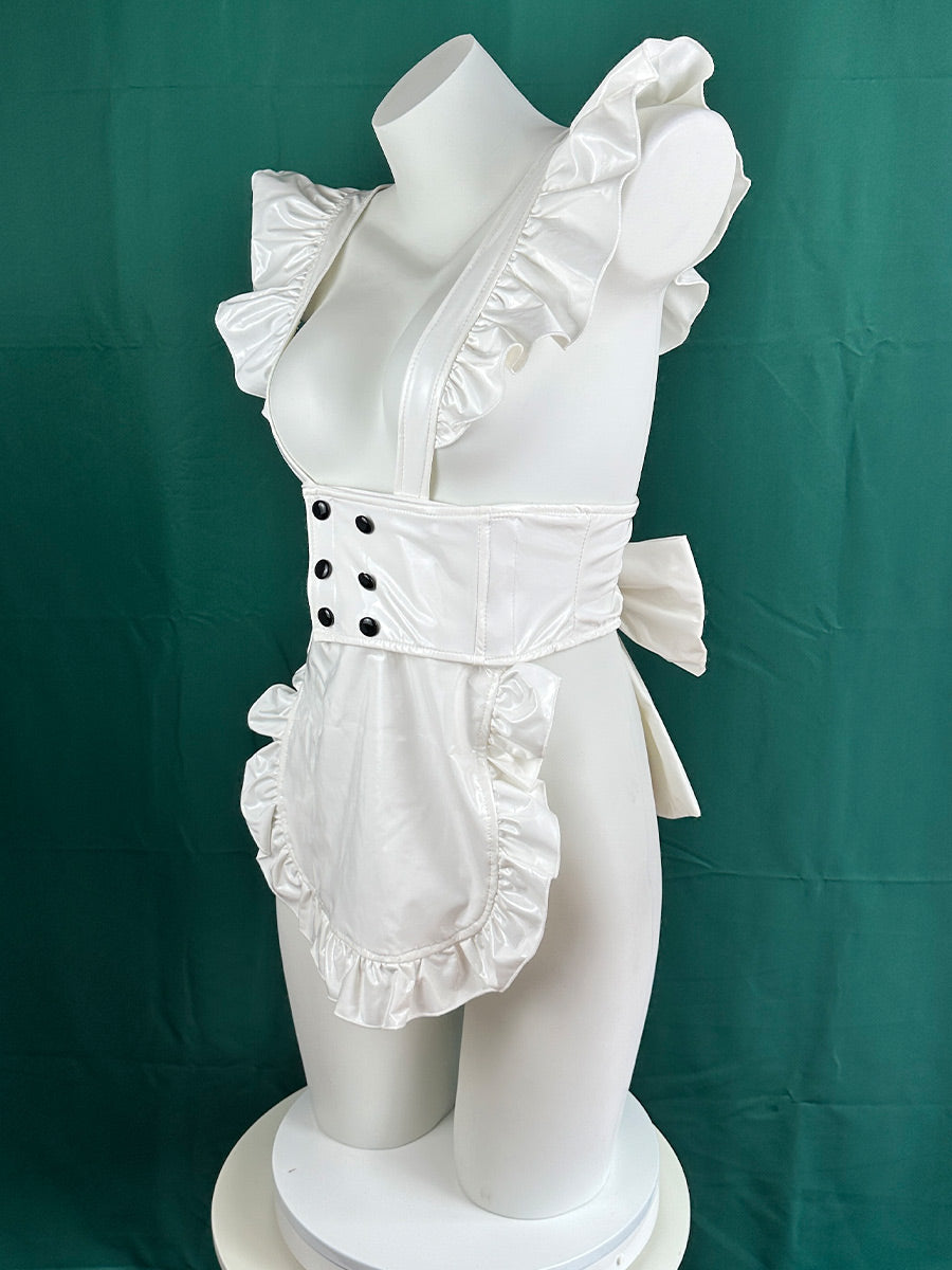Design: Slutty maid costume featuring a white pu leather apron with a ruffled trim and back bow design, front black buttons accent, with fun and flirty cat ear headband included, you'll be the purr-fect maid for any party or roleplay.