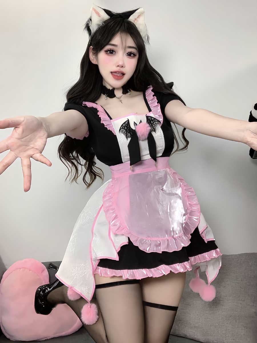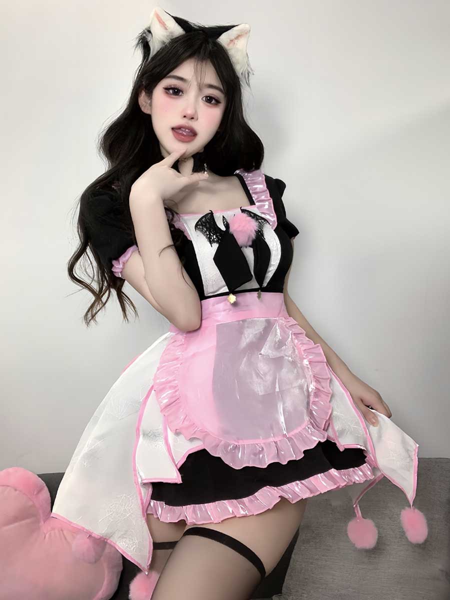 Product SPU: CS2L15766 Brand: Asrrss Color: Black/Pink Material: Polyester Size: S, M, L Weight:Recommended weight for 88-132lbs Pattern: Color Block Type: Neckline: Square Neck Sleeve Length: Short Sleeve Design: Asrrss Sexy Maid Outfit featuring black and white mini maid dress with ruffled trim, puff short sleeves, front lace bat accents, sides draping panels with an attached furry poms, and a matching pink apron, back tie closure, A classic look with playful detailing, this outfit is designed for all your cosplay needs. Occasion: Kawaii Lolita Maid Costume isperfect for bridesmaid, hen night, geisha theme party, cosplay, wedding, christmas, Halloween cosplay, bunny girl theme party, birthday party, masquerade, stage performance, theme photography, bunny girl anime fan gift, etc. Package Including: Maid Costume: 1* Maid Dress+1* Apron