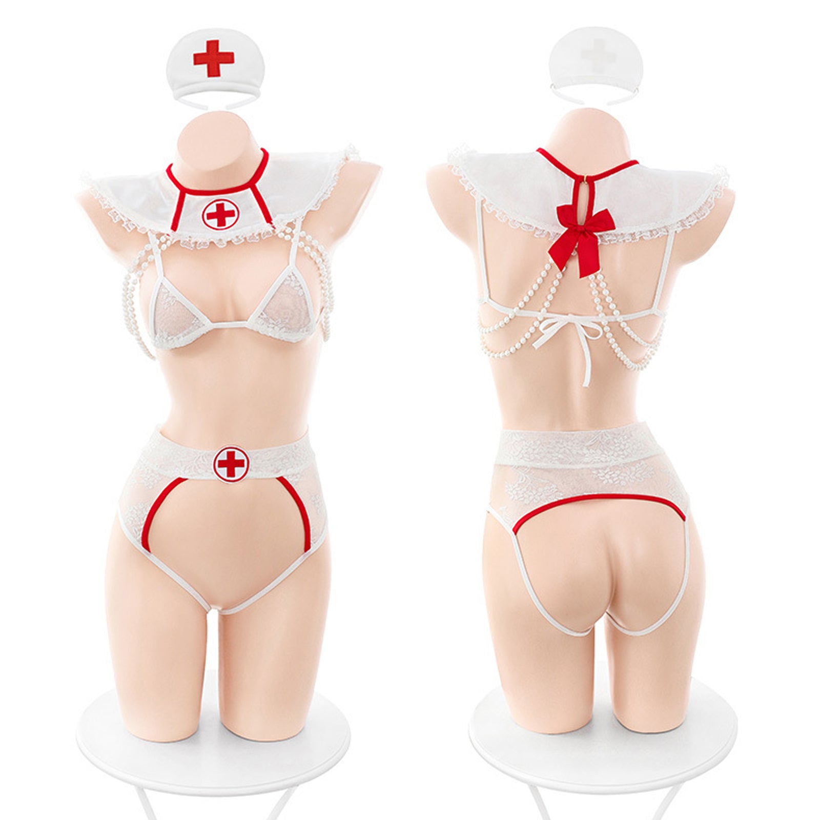 Design: Sexy Nurse Lingerie Outfits featuring a mirco triangle lace cups with ties back, a white collar neckpiece with lace ruffled trim and hospital cross logo, back hook closure, red bow accents, stunning draping pearl details, and matching high waist open crotch shorts with booty framing straps.
