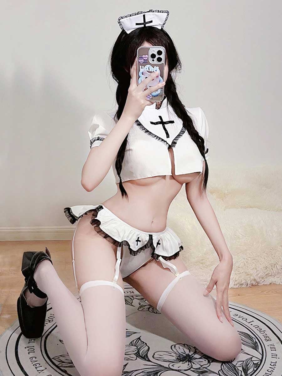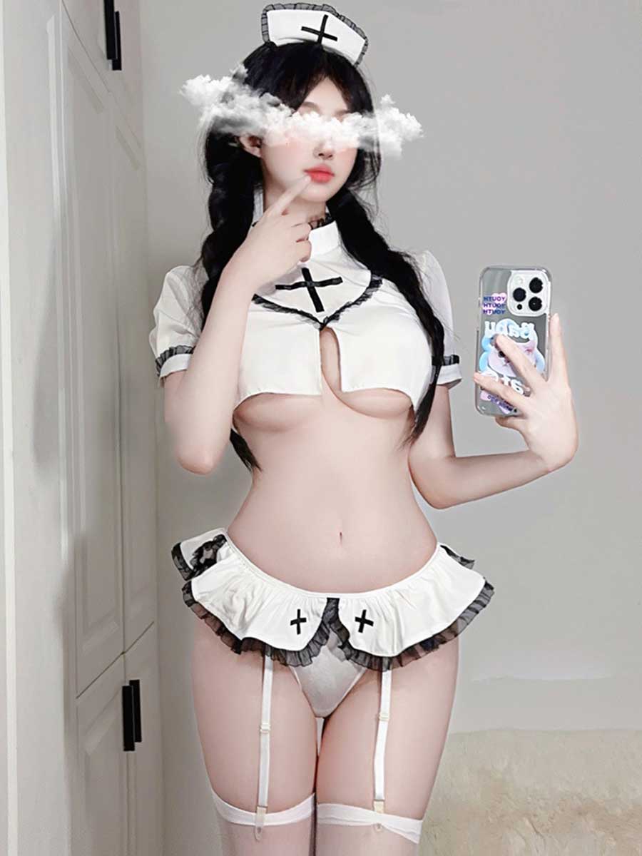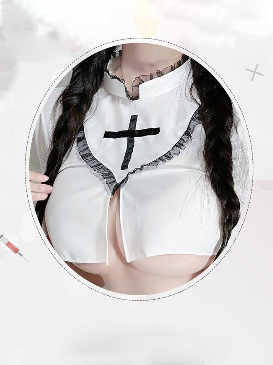 Product SPU: CS2L15779 Brand: Asrrss Color: White Material: Polyester, Spandex Size: M/L, XL, 2XL, 3XL Weight: Recommended weight for 88-210lbs Pattern: Cross Type:Nurse Costume Neckline:Stand Collar Sleeve Length: Short Sleeve Design: Nurse Cosplay Lingerie featuring a white crop top with a black mesh trim, a hospital cross detail, short puff sleeve, back lace-up closure, and a matching panty with ruffled trim, looks a little big cool and a little fashion. Occasion: This Adult Sexy Nurse Outfit is perfect for Valentine's day, honeymoon, bedroom, bathroom, special night, nightwear, night club wear, cosplay party, anime cosplay, Halloween, Carnival, comic con,etc. It's also a great gift for yourself, girlfriend and Anime fans. Package Including:1x Nurse Headpiece+1x Crop Top+1x Panty+1 pair of Stocking