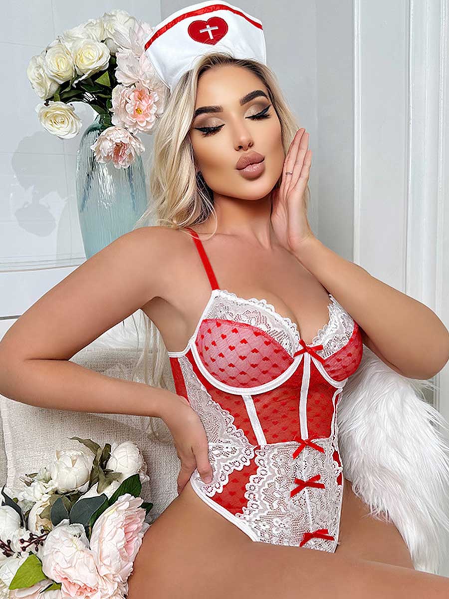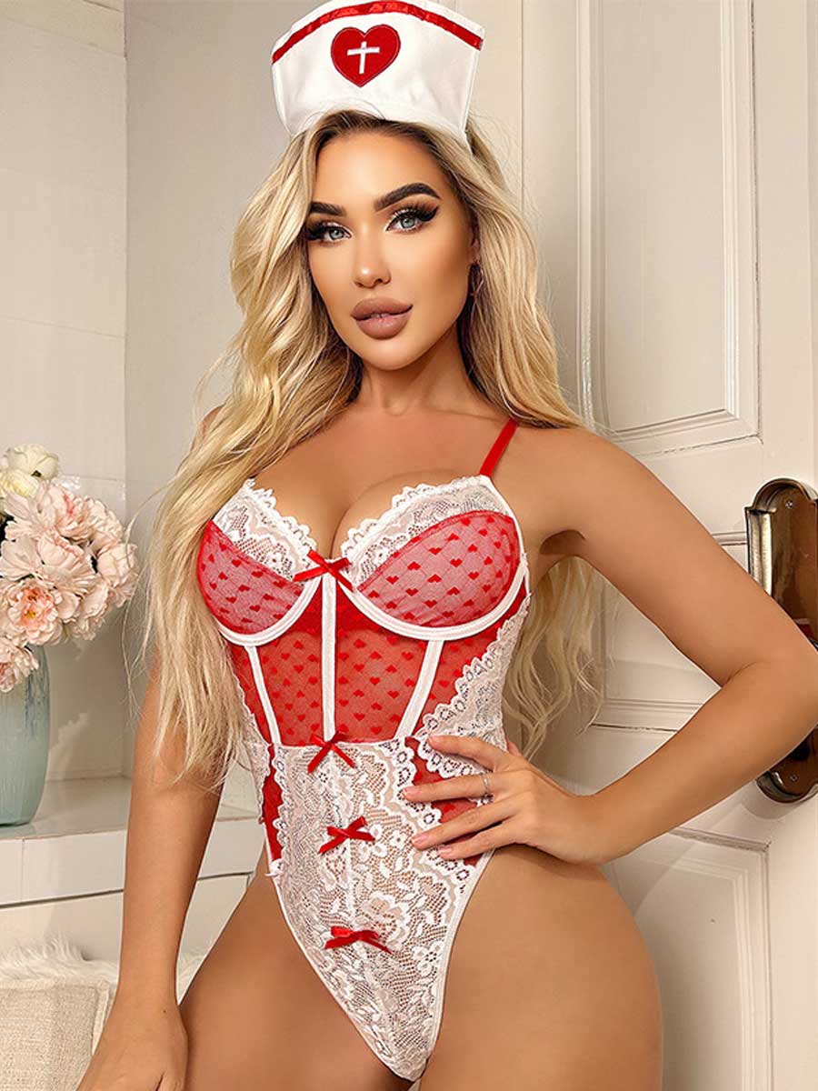 Design: Nurse Cosplay Lingerie featuring sultry white and red teddy bodysuit with sheer lace underwire cups, adjustable spaghetti straps, satin bow accents, a cheeky cut back, Show off your curves in this sensual nurse costume – perfect for cosplay or any special occasion.