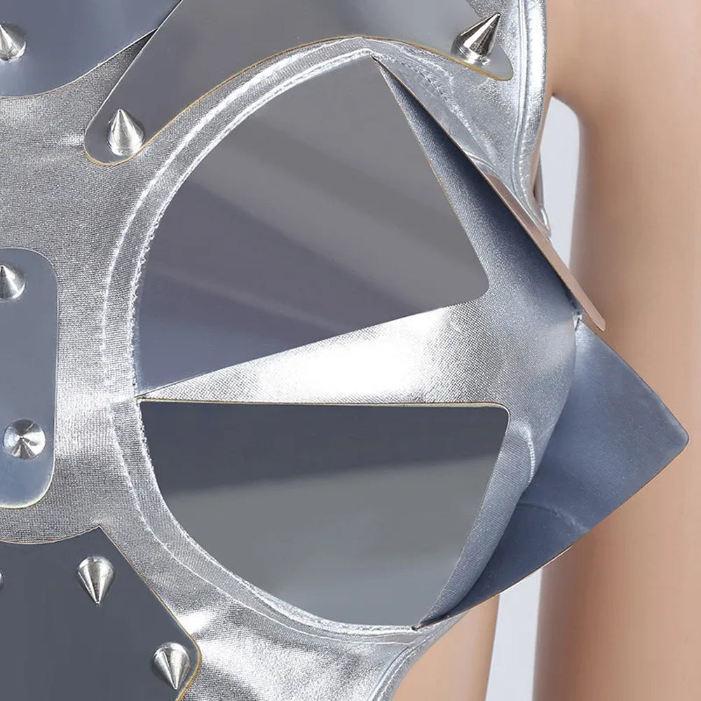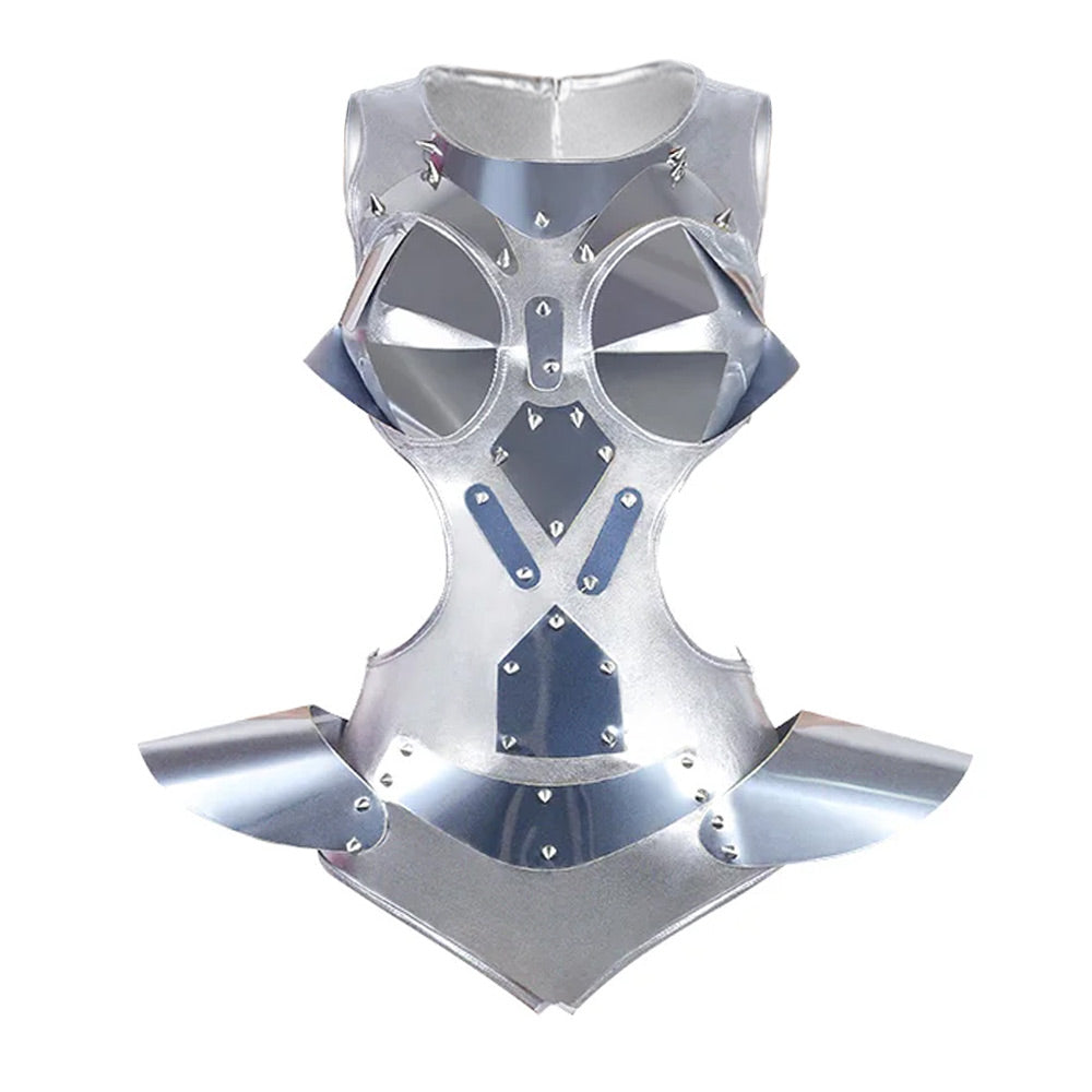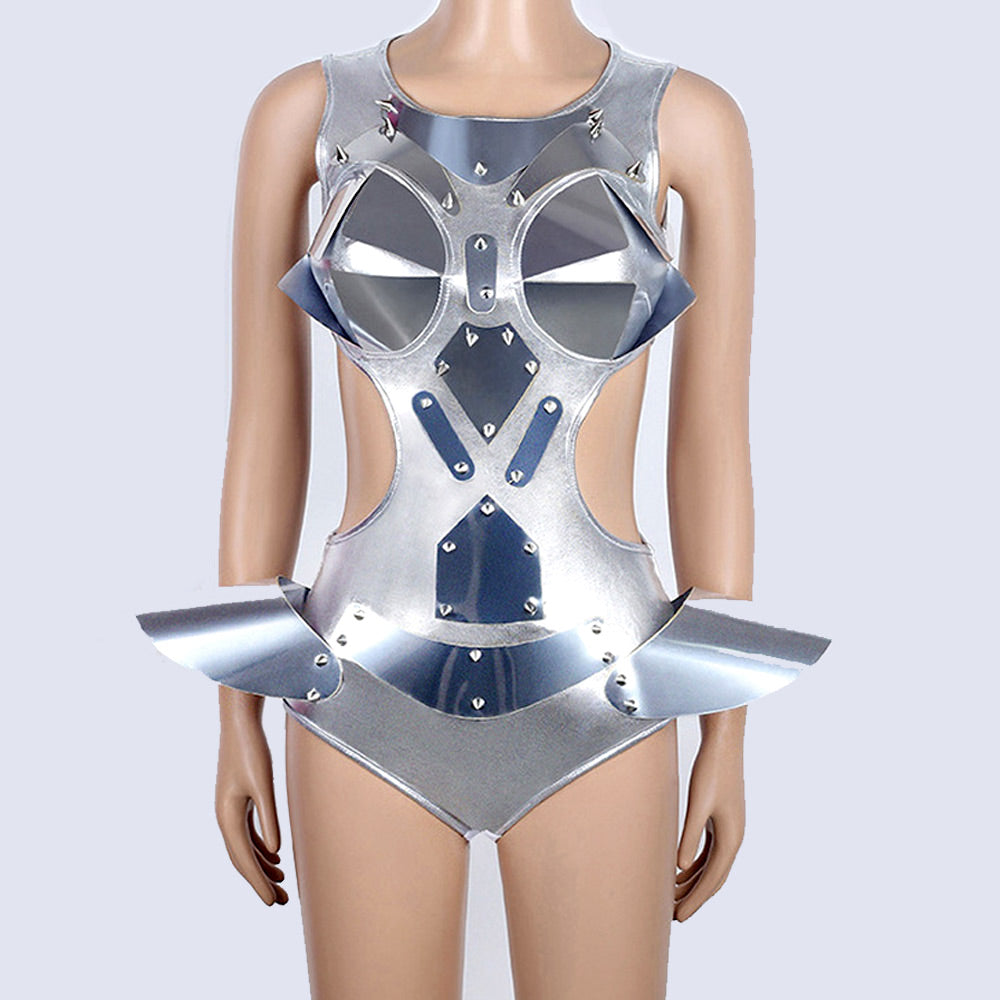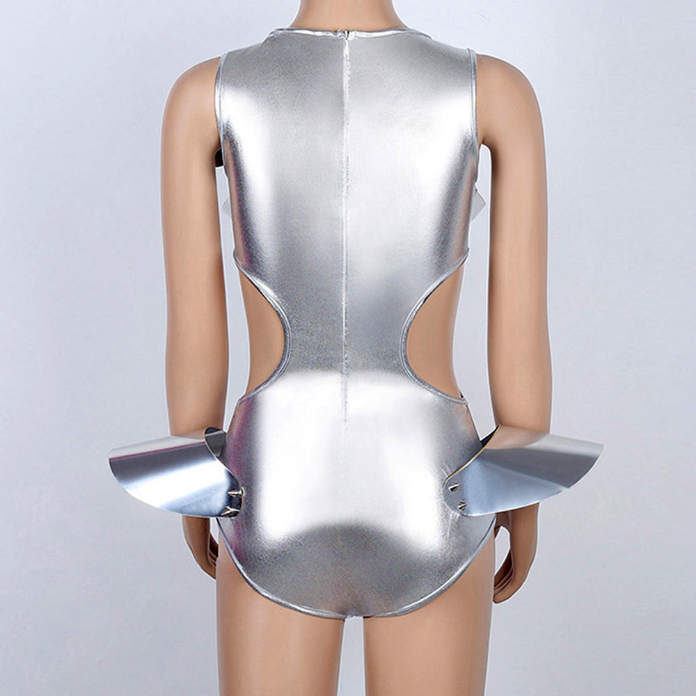 a silver metallic bodysuit with silver stud accents, sides cut-out design, back zipper up closure, This costume includes an eye-catching silver metallic bodysuit, giving you an interstellar look that's sure to turn heads. Occasion: Sexy exotic dancer outfits is a good choice for Christmas, Valentine's Day, Date nights, bar, night club, party, evening, banquet, birthday, holiday, vacation, special occasion, rave, festival and other activities.Package Including: 1* metallic bodysuit