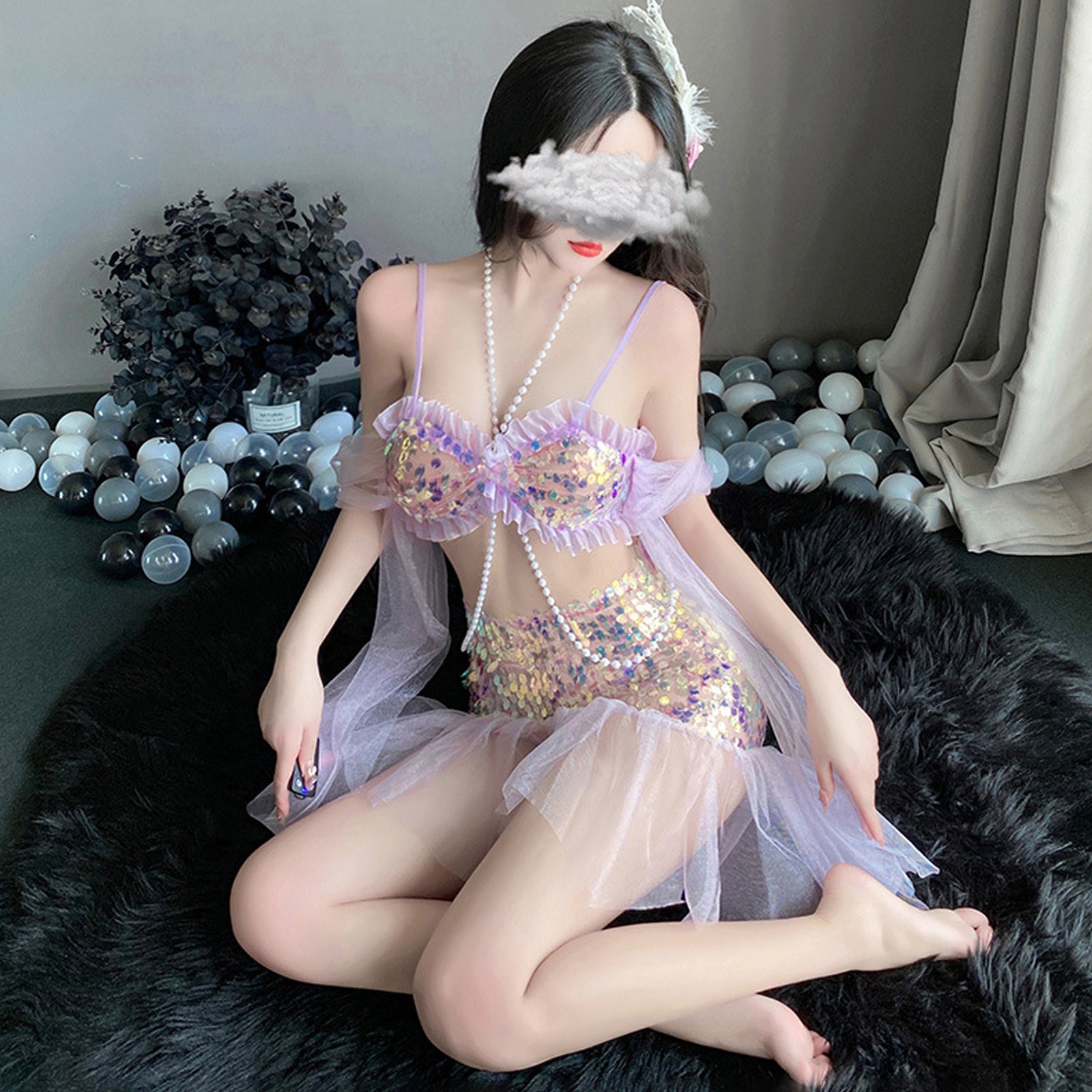 Design: Asrrss Sexy Mermaid Cosplay Costume featuring sheer mesh cups with ruffled trim, an allover sequins wave design, draping pearl accents, halter ties, a hook and eye back closure, and a matching mini bodycon skirt, back lace-up closure, a light purple mesh hem.