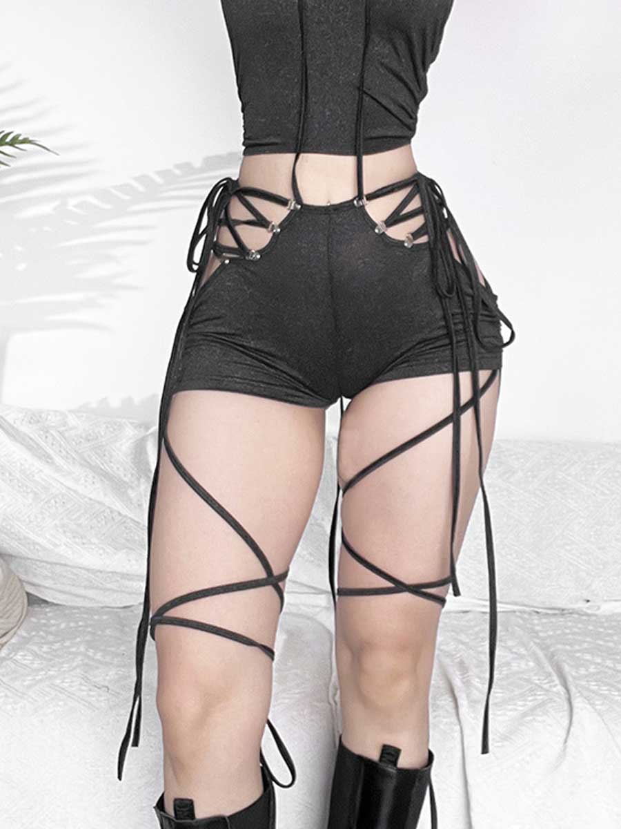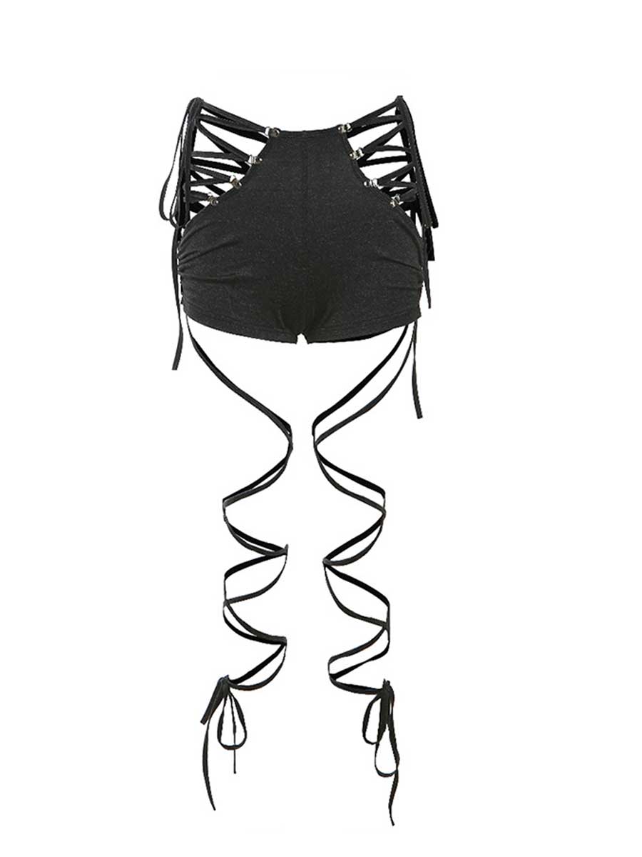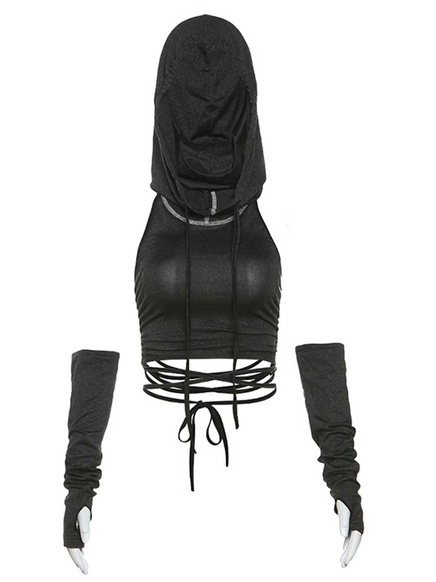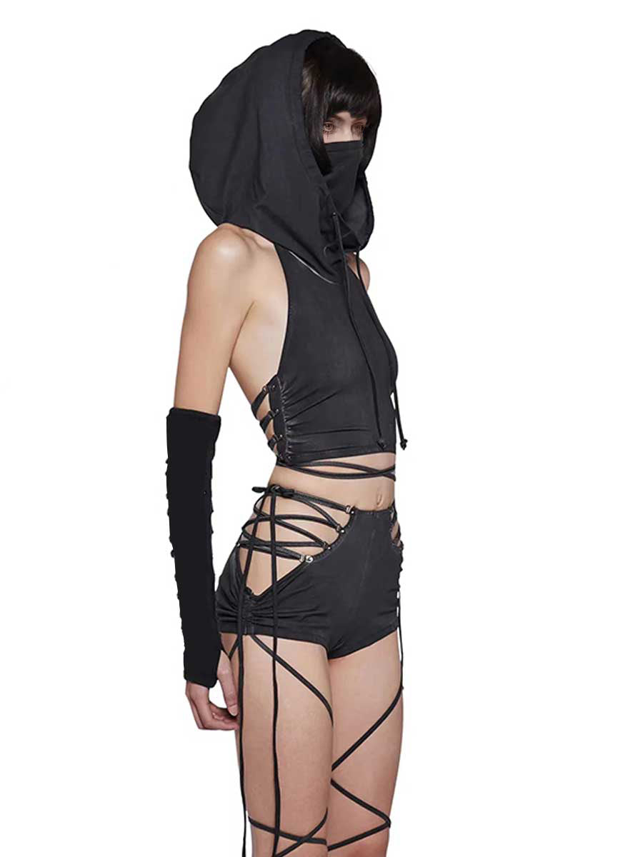 Design: Adult Ninja Costume featuring a cropped top with a hooded, open back and lace-up closure, and high neckline to help you hide your identity, a mactching shorts, an attached leg wraps with tie closures. Experience the full mystical transformation with the intricate details of this costume, designed to make you look and feel like a true ninja.