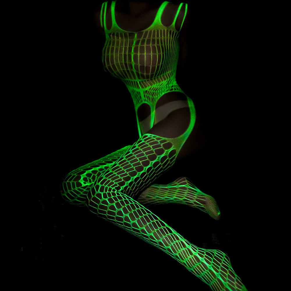 Note: This Luminous Fishnet Bodystocking must be exposed to sunlight or light for a while before it glows, the light intensity increases, colors appear sharpe.
