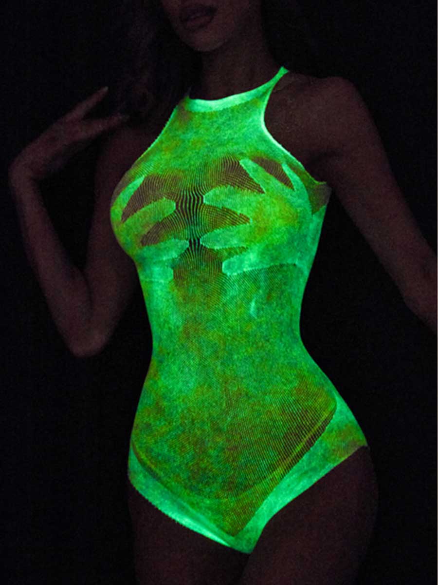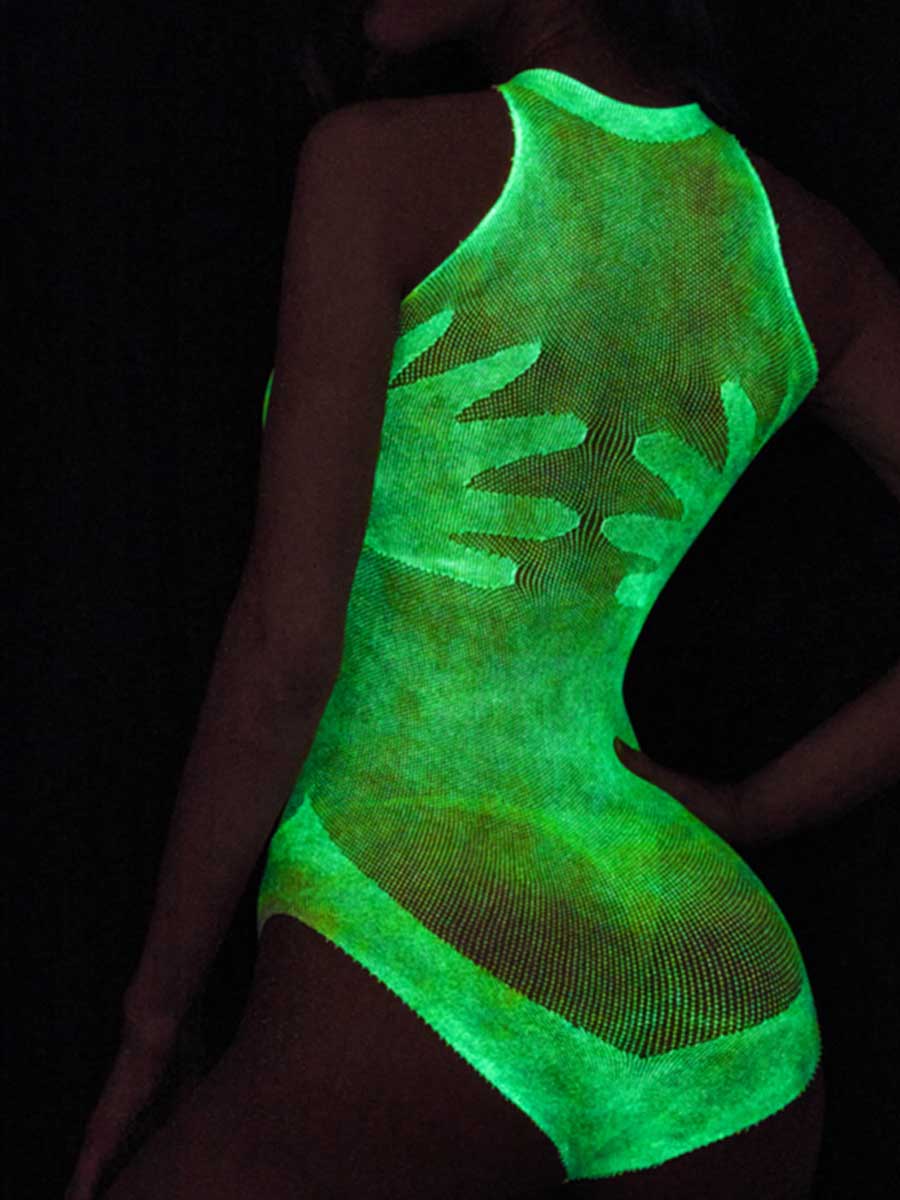 Design: This sexy luminous bodysuit featuring a sheer mesh cups, a high neckline, a sheer bodice, a high cut leg, and a thong cut back. The higher the light intensity, the longer the irradiation time, the more obvious the color will be displayed.