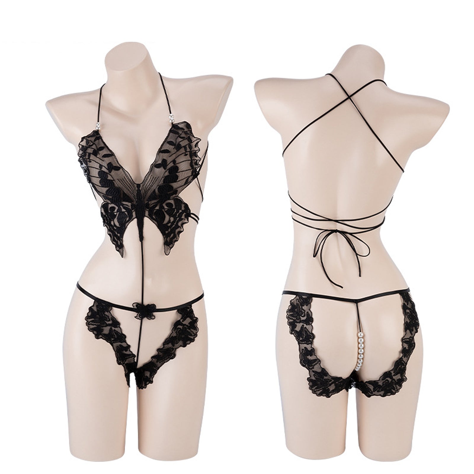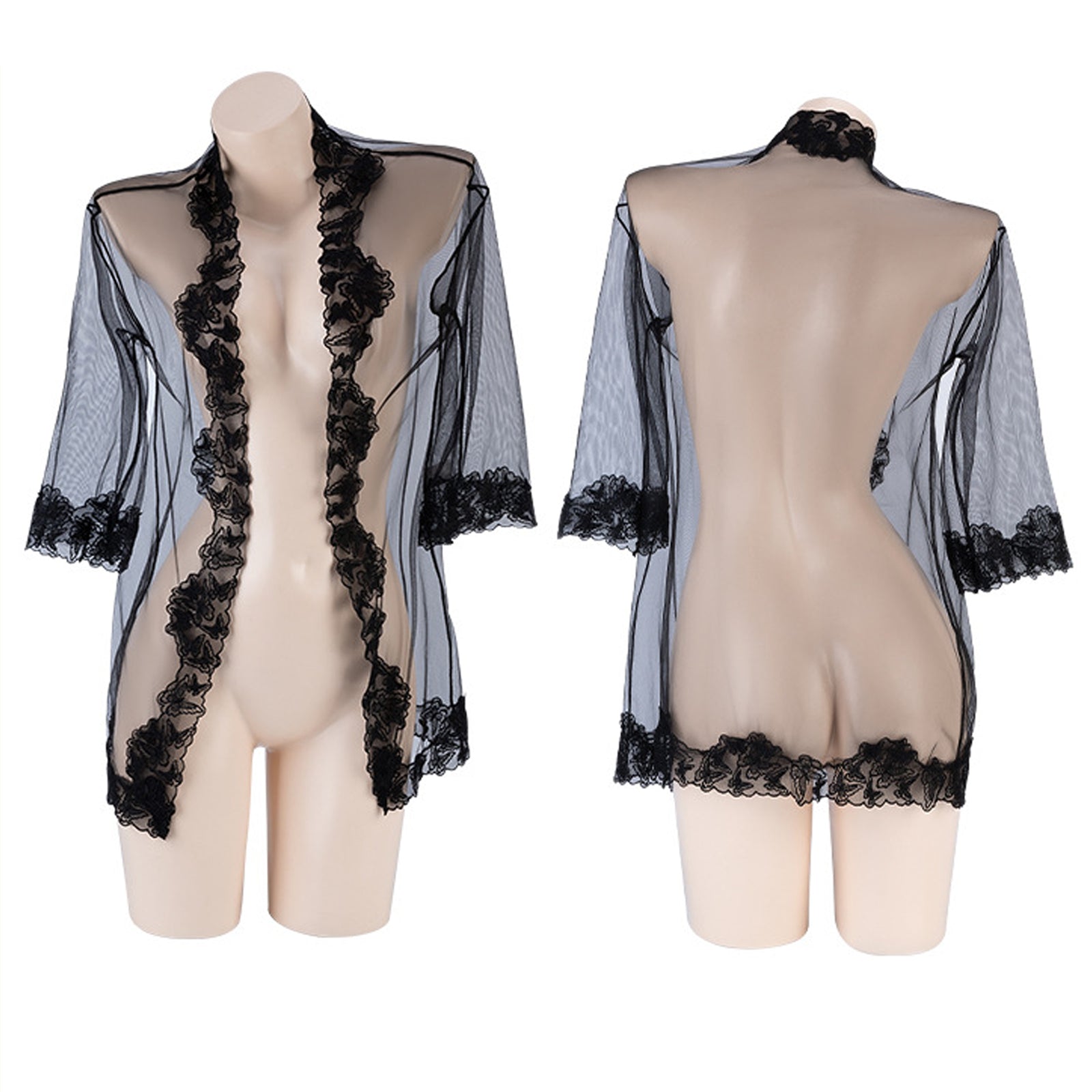 Design: 2 Piece Sleepwear Set - This ultra sexy teddy featuring sheer mesh cups with butterfly appliques, a strappy open bodice with back ties closure, and a matching open crotch panty with unique design-pearl. Robe featuring delicate sheer mesh and appliques trim, long loose kimono sleeves.