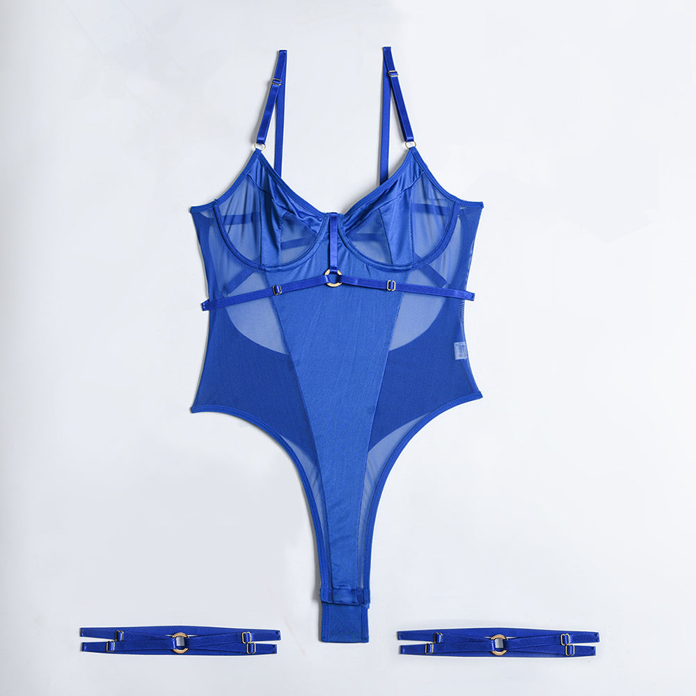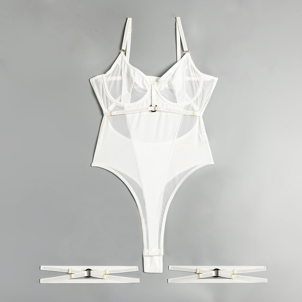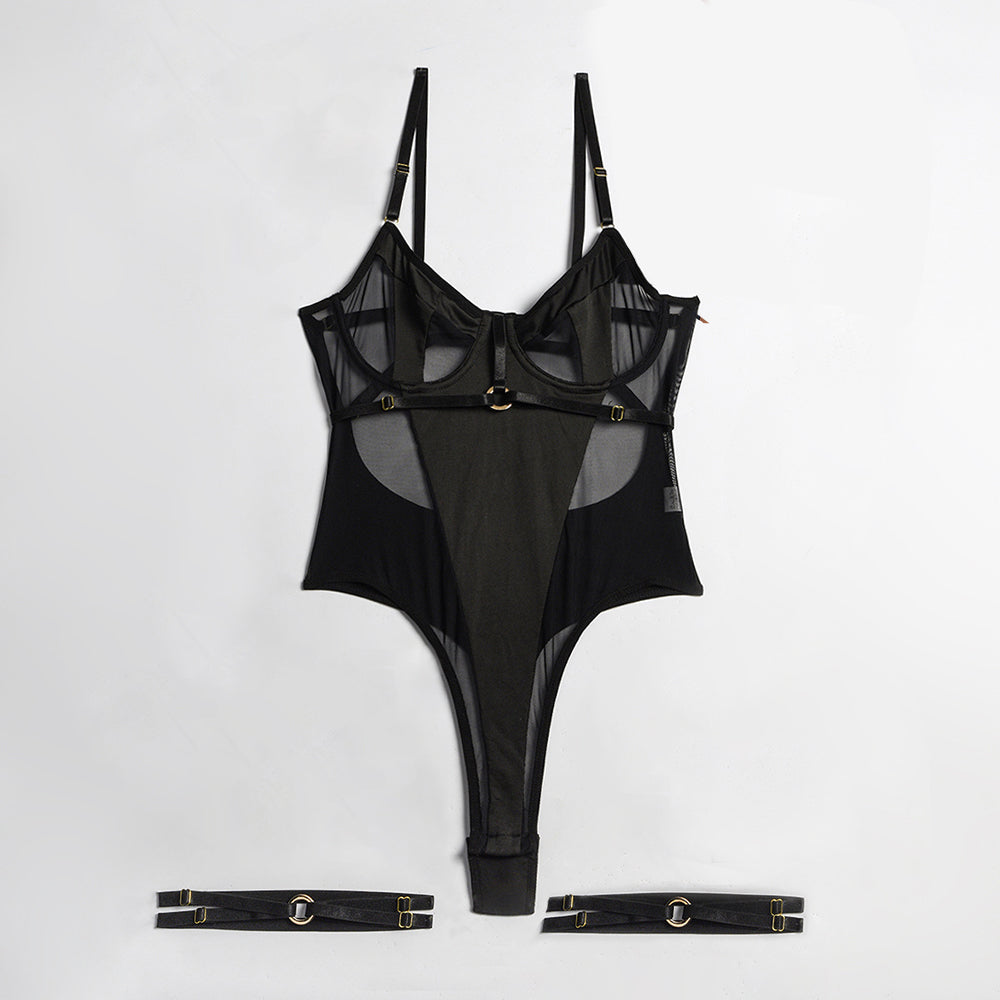Design: This sexy bodysuit featuring solid and mesh cups, a strappy bust with a center metal O-ring, adjustable spaghetti straps, a cage back band with a hook and eye closure, a solid bodice with mesh side panels, an open back, wrap-around leg garters, a velcro crotch, and a thong cut back.