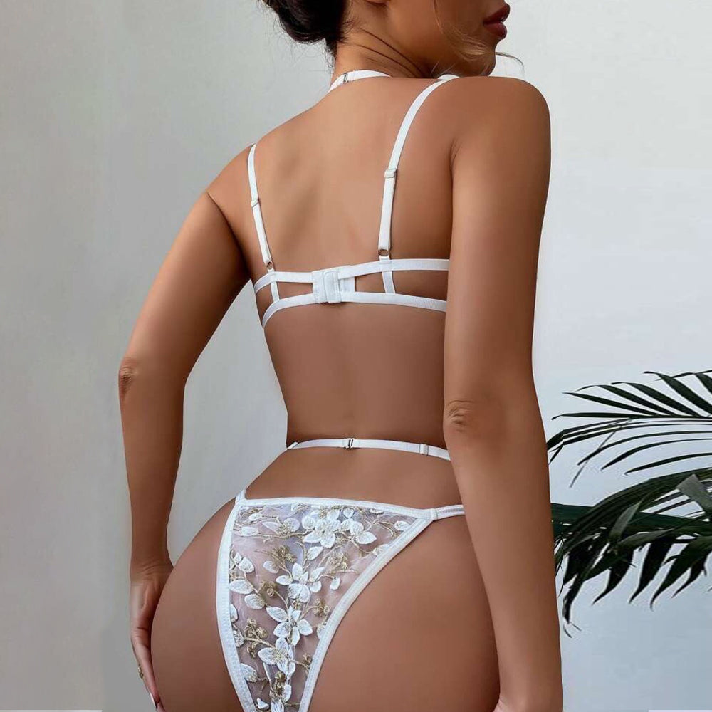 Design: Sexy Floral Embroidered Teddy Lingerie Bodysuit featuring sheer floral lace underwire cups, halter and adjustable spaghetti straps, a cage style back band with a hook and eye closure, side cut-outs, a narrow center bodice panel with chain accents, and a thong cut back.