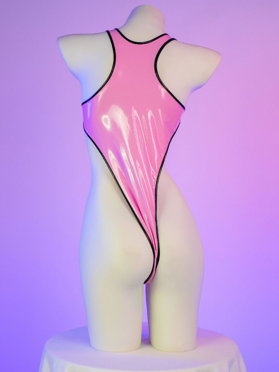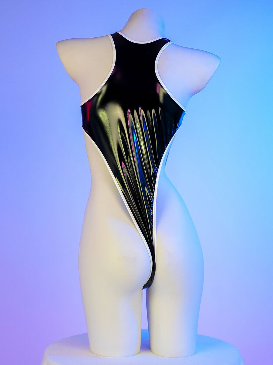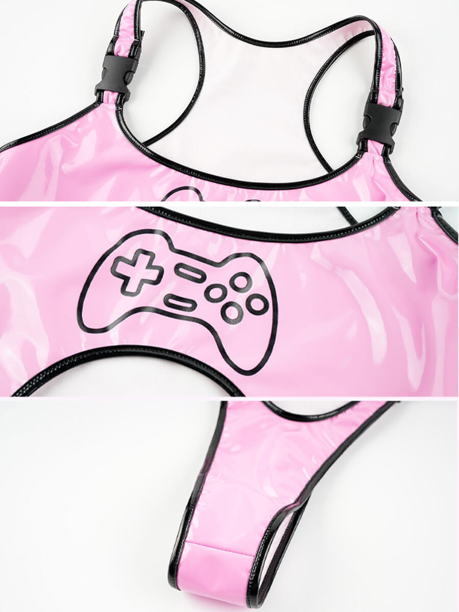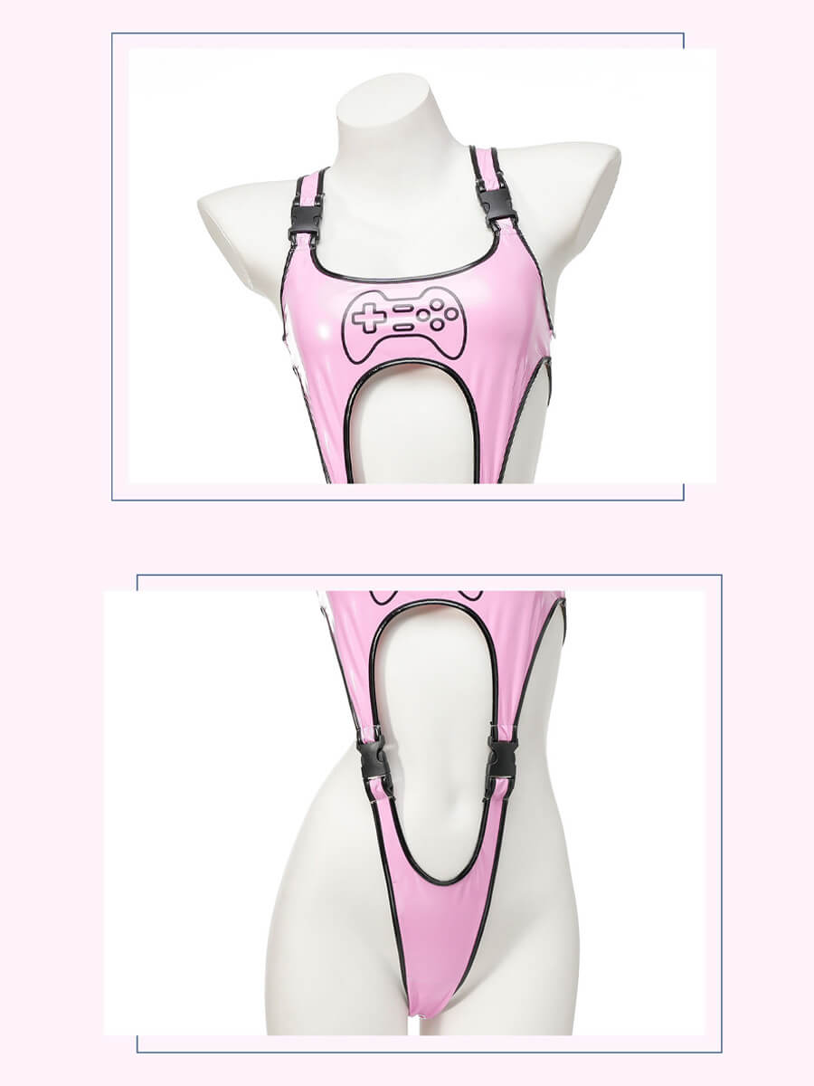 Design: This vinyl bodysuit for women has a cutout construction, a front buckle and gamepad print, Add its basic shirt and jeans cover ups for a look that's going to take everyone's breath away.