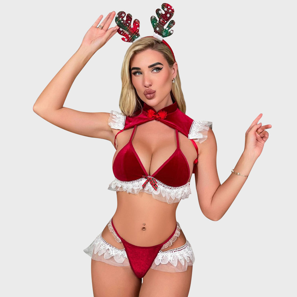 Design: Red christmas lingerie features triangle cups with white lace underbust,